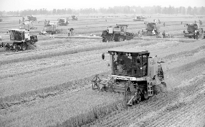 圖為聯合收割機在河南省唐河縣桐寨鋪鎮收割小麥 資料圖