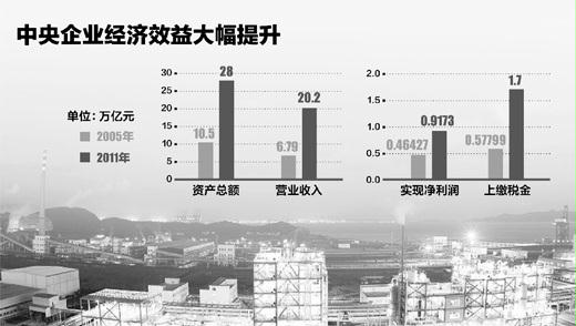 在1994年,我國最大的500家國有企業(yè)全年銷售收入的總和還不如美國通用汽車公司一家的銷售收入。甚至在2003年國務(wù)院國資委成立時(shí),196家央企中的不少企業(yè)還在為不良資產(chǎn)處置發(fā)愁。而2011年公布的世界500強(qiáng)企業(yè)中,中央企業(yè)已有38家上榜。“十一五”的5年,中央企業(yè)資產(chǎn)總額、營業(yè)收入、上繳稅金和稅后凈利潤(rùn)等主要經(jīng)營指標(biāo)均實(shí)現(xiàn)了翻番,年均國有資產(chǎn)保值增值率達(dá)到115%。