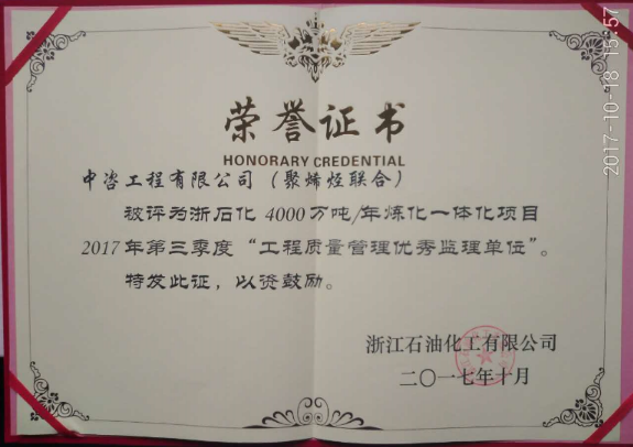 2017年10月,中咨工程有限公司浙石化聚烯烴聯合監理部被業主浙江石油化工有限公司評為浙石化4000萬噸/年煉化一體化項目2017年第三季度“工程質量管理優秀監理單位”。