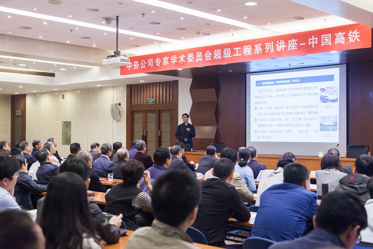 2017年10月16日上午,公司專家學術(shù)委員會舉辦第三期中國超級工程系列講座,邀請原鐵道部副部長盧春房作了題為《中國高速鐵路創(chuàng)新與發(fā)展》的學術(shù)講座,并進行了現(xiàn)場互動交流。 公司領(lǐng)導、專家學術(shù)委員會領(lǐng)導、部分資深專家和交通、高技術(shù)專家組專家、公司各部門和所屬企業(yè)職工200余人參加。 學術(shù)講座現(xiàn)場 盧春房同志作學術(shù)講座 | |||||