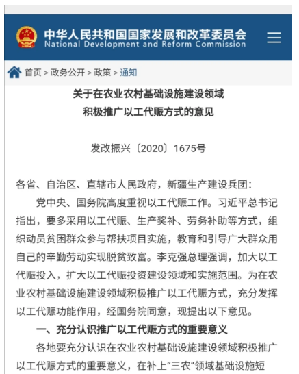 為推動鞏固拓展脫貧攻堅成果同鄉(xiāng)村振興有效銜接,更好發(fā)揮以工代賑“賑”的作用,帶動更多農(nóng)村低收入人口就近就業(yè)增收,近日,經(jīng)國務院同意后,國家發(fā)展改革委聯(lián)合有關部門和單位印發(fā)實施了《關于在農(nóng)業(yè)農(nóng)村基礎設施建設領域積極推廣以工代賑方式意見》(以下簡稱《意見》),進一步拓展了以工代賑的推廣范圍,細化了推廣以工代賑方式的組織及管理要求,明確了多部門協(xié)同推廣以工代賑方式的工作機制。 一、《意見》出臺正逢其時、意義重大 以工代賑是指通過組織農(nóng)村群眾參與工程建設獲取勞務報酬,以取代直接賑濟的一項幫扶政策。自1984年啟動實施以來,國家已累計安排以工代賑資金(含實物折資)超過1600億元。特別是脫貧攻堅戰(zhàn)打響以來,通過組織農(nóng)村貧困群眾和低收入人口參與當?shù)刂行⌒突A設施建設,幫助他們依靠自身勞動獲取報酬,達到了緩解貧困、激發(fā)增收致富內(nèi)生動力等效果,推動了扶貧同扶志扶智的有效結(jié)合。以工代賑項目的實施使得貧困地區(qū)生產(chǎn)生活條件顯著改善,為助力打贏脫貧攻堅戰(zhàn)發(fā)揮了重要作用,實現(xiàn)了減貧與區(qū)域發(fā)展的結(jié)合與統(tǒng)一,受到貧困地區(qū)干部群眾的廣泛歡迎。 黨中央、國務院高度肯定以工代賑政策所取得的成效。習近平總書記2017年、2018年在深度貧困地區(qū)脫貧攻堅座談會和打好精準脫貧攻堅戰(zhàn)座談會上強調(diào),要多采用以工代賑、生產(chǎn)獎補、勞務補助等方式,組織動員貧困群眾參與幫扶項目實施,教育和引導廣大群眾用自己的辛勤勞動實現(xiàn)脫貧致富。2018年6月,中共中央、國務院印發(fā)實施的《鄉(xiāng)村振興戰(zhàn)略規(guī)劃(2018-2022年)》明確指出,要結(jié)合基礎設施建設等工程建設,鼓勵采取以工代賑方式就近吸納農(nóng)村勞動力務工。今年疫情和災情發(fā)生以來,習近平總書記等中央領導同志高度重視農(nóng)村勞動力就業(yè)工作,李克強總理多次強調(diào)要加大以工代賑投入,帶動更多農(nóng)民工就近就業(yè)。 《意見》深入貫徹黨的十九屆五中全會精神,主動順應鞏固拓展脫貧攻堅成果、全面推進鄉(xiāng)村振興的新形勢新任務新要求,堅持守正創(chuàng)新,在強調(diào)組織群眾務工、發(fā)放勞務報酬等政策初衷的基礎上,對推廣以工代賑方式的實施范圍、建設領域、保障措施和聯(lián)動機制等進行了探索創(chuàng)新、拓展細化,從而推動這項好政策落到實處、取得實效。因此,《意見》的出臺,將有助于更好發(fā)揮以工代賑政策“賑”的作用,在拓寬農(nóng)村就業(yè)渠道、持續(xù)增加農(nóng)民收入、補上“三農(nóng)”領域突出短板、激發(fā)群眾內(nèi)生動力等方面帶來多重效益。 二、堅持守正,準確把握以工代賑政策初衷 一是繼續(xù)瞄準帶動農(nóng)村勞動力就業(yè)。對于采取以工代賑方式實施的農(nóng)業(yè)農(nóng)村基礎設施項目,有關行業(yè)主管部門要鼓勵引導項目實施單位按照就地就近的原則,優(yōu)先吸納脫貧不穩(wěn)定戶、邊緣易致貧戶和其他農(nóng)村低收入人口參與工程建設,在確保工程質(zhì)量和項目進度的前提下,盡量動員當?shù)剞r(nóng)村勞動力參與,最大可能提供更多就業(yè)崗位。積極開展技能培訓,解決農(nóng)村勞動力技能不足問題。 二是繼續(xù)強調(diào)勞務報酬及時足額發(fā)放。采取以工代賑方式實施的項目,同樣強調(diào)在前期工作階段就要明確用工計劃,對吸納當?shù)剞r(nóng)村勞動力情況等予以說明;項目立項審批階段,勞務報酬發(fā)放總量及發(fā)放比例是各級政府項目資金分配的重要考慮因素;在項目竣工驗收階段,勞務報酬支付標準、金額和發(fā)放名冊將作為重要考核依據(jù)。各地需結(jié)合實際,合理確定勞務報酬標準,盡量提高勞務報酬比例,確保及時足額發(fā)放。 三是繼續(xù)強化對采取以工代賑方式實施項目的督促指導。《意見》明確,對于采取以工代賑方式實施的農(nóng)業(yè)農(nóng)村基礎設施項目,按照招標投標法和村莊建設項目施行簡易審批的有關要求,可以不進行招標。省級發(fā)展改革部門要積極會同相關部門,采取工作會商、實地督導、聯(lián)合調(diào)研、定期調(diào)度等方式,加強工作和技術(shù)指導,協(xié)調(diào)幫助市縣解決在以工代賑方式推廣工作中出現(xiàn)的困難和問題。 三、注重創(chuàng)新,積極推廣以工代賑方式 一是明確以工代賑方式實施范圍并細化建設領域。《意見》將采取以工代賑方式實施項目的領域,全面拓展到農(nóng)業(yè)農(nóng)村生產(chǎn)生活基礎設施、交通基礎設施、水利基礎設施、文化旅游基礎設施、林業(yè)草原基礎設施等五個領域,并作進一步細化。如,增加了災毀水毀農(nóng)村小型基礎設施恢復重建,防止因災致貧返貧。 二是強化以工代賑實施項目的投入保障力度。文件明確要求,各地要將符合條件的農(nóng)業(yè)農(nóng)村基礎設施項目按規(guī)定納入地方政府專項債券和抗疫特別國債支持范圍,并在組織實施專項債券和抗疫特別國債項目時,大力推廣以工代賑方式,多渠道擴大以工代賑實施規(guī)模。農(nóng)業(yè)農(nóng)村、交通、水利、文化旅游、林草、扶貧等部門在開展相關農(nóng)