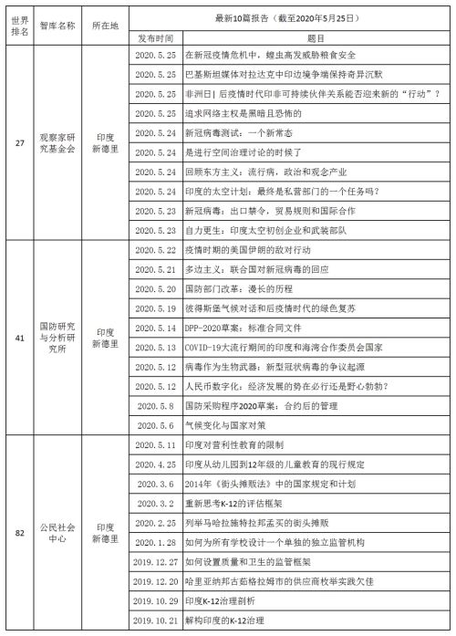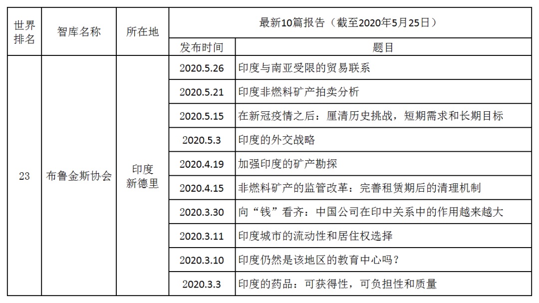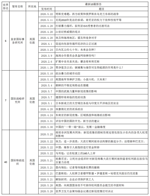 當今世界處于百年未有之大變局,智庫作為連接專業智慧與公共政策的橋梁,已成為國家治理和全球治理的重要支撐。對比我國和美、英、印等國智庫發展情況,可以發現我國智庫主題式研究和階段化研究明顯,持續跟蹤型研究少、系統化研究少。未來我國國家治理體系可能逐步邁入“政、智”一體化的治理新模式,伴隨我國國際地位和國際話語權的提升,建議我國智庫借鑒國際頂級智庫成果形成經驗,在發展規劃層面和研究站位層面能夠與時俱進,抓住跳躍式發展契機,實現我國智庫在全球區位的高質量發展。 一 智庫的內涵及其在政府決策中的地位 (一)智庫的內涵 智庫(Think Tank),顧名思義,是智慧力量、智慧資源的集結。在現代社會,智庫是決策者及決策機構的智囊團和思想庫。美國外交關系委員會主席理查德?哈斯將智庫的職能概括為五個方面:生產理念(Idea Factory)、供給人才(Providing Talent)、謀求共識(Convening Professionals)、教育公眾(Engaging the Public)和充當政府外交的“第二渠道”(Bridging Differences)。 影響力是智庫的生命力之所在,是智庫賴以生存和發展的核心競爭力。智庫一般以政策研究為內核,通過內部或公開渠道,為政府提供政治、經濟、社會、科學、技術等多領域專業咨詢建議,產生影響力。作為獨立于政府之外的第三方機構,智庫具備的政治職能和政治影響力成為智庫立身之本,也是智庫發展的最終目的。 (二)智庫在政府決策中的地位 二十一世紀以來,金融危機、自然災害、糧食危機、軍事沖突、貿易爭端、新冠疫情等全球性治理難題頻發。不論從短期還是從長期來看,世界權力結構、經濟結構、社會結構均在發生劇烈變化,全球化發展的多樣性、復雜性和不確定性不斷增加,倒逼整個政治系統迅速推進國家治理體系及治理能力現代化、法制化、專業化。在此改革進程之中,參政、議政、輔政、問政等政治活動儼然已與智庫的智力支持密不可分。 世界上最主要的社會性權力有五種:政權、法權、財權、智權和德權。政權和法權是國家和政治所賦予的,財權是市場與資本所賦予的,智權取決于科學(包括自然科學和社會科學)、學術制度和社會理性,德權則取決于社會結構、道德崇敬和社會感性。其中,政權擁有者是政府與官員,屬于政治系統;智權擁有者的典型代表是智庫與專家,屬于知識系統。 由于政治系統本身并不具備知識系統的專業技術儲備,因而政治系統的決策者需要配備知識系統的知識生產者作為外援。 一方面,智庫打破了政權和智權、政治系統和知識系統之間的藩籬,以智庫為橋梁,使得決策變成更為理性的行為,由政府官員與專家學者共同完成。實現政治理性與技術理性的完美契合,使得“政”與“智”的聯系以及“治理”能力與“智力”能力的結合愈加緊密,國家治理體系逐步邁入“政、智”一體化的治理新模式。縱觀世界各國現代化發展歷程,智庫在國家治理中一直發揮重要作用,并日益成為國家治理體系不可或缺的組成部分。 另一方面,智權的出現,實質上推動了決策與執行的分離,是一種對政權的“改革”。在政策制定、執行、監督整個過程中,政與智的結合并不拘泥于以官為主,以專家為輔,有時甚至以專家為主,官員為輔。例如,在2020年初發生的新冠疫情“戰役”時期,大部分決策是由衛生防疫和權威的醫學專家做出的,在這種特殊時期,專家的權威會被無形放大,成為政策制定的指引和導向。 二 全球智庫發展概況及其最新成果特點 (一)全球智庫總量近年增長情況 美國賓夕法尼亞大學智庫與公民社會項目組(TTCSP)編寫的《全球智庫報告》(Global Go To Think Tank Index Report),雖然評價方法和結果存在爭議,但一直被認為是最權威的全球智庫發展報告。根據2020年1月發布的《全球智庫報告2019》,對比2015至2019年發布的報告,全球智庫2014年至2019年的排名發生了較大變動,如表1所示。 由美國賓夕法尼亞大學智庫與公民社會項目組(TTCSP)編寫的年度《全球智庫報告》雖然在評價方法和結果上越來越產生爭議,但根據項目組對全球智庫機構建立的索引來看,全球智庫2008年是5465家,2019年是8248家,正在快速增長,智庫不僅在發達國家已為數眾多,而且在發展中國家也與日俱增。 表1 全球主要國家智庫數量近年變化情況 來源:《全球智庫報告》2014-2019。 從表1可以看出: 2014年至2017年,美國、中國、英國的智庫數量一致保持在全球前三。期間,美國智庫總量增長42家,增長率達到2.3%;中國增長83家,增長19.3%;英國增長157家,增長率高達54.7%。 2018年至2019年間,美國智庫總量沒有變動,中國智庫總量減少5家,英國減少123家。2018年,印度智庫異軍突起,總量增長73.7%,由293家增長到509家,超過中國和英國,躍居全球第二。2018年,阿根廷、俄羅斯的智庫總量也保持較快增長,增長率分別達到55.5%、108.7%。 (二)美國頂尖智庫及其研究成果 1.美國的全球智庫排名情況 作為全球智庫數量最多的國家,全球排名前十的智庫,美國常年占據5-6個席位,但具體智庫機構名稱及其排序也在變化。 2014年美國進入全球智庫排名前十共6家,分別是布魯金斯學會(第1名)、卡內基和平基金會(第3名)、國際戰略研究中心(第4名)、蘭德公司(第7名)、外交關系學會(第8名)、伍德羅·威爾遜國際學者中心(第10名)。 在2019年,美國進入全球智庫排名前十共5家,分別是卡內基和平基金會(第1名)、國際戰略