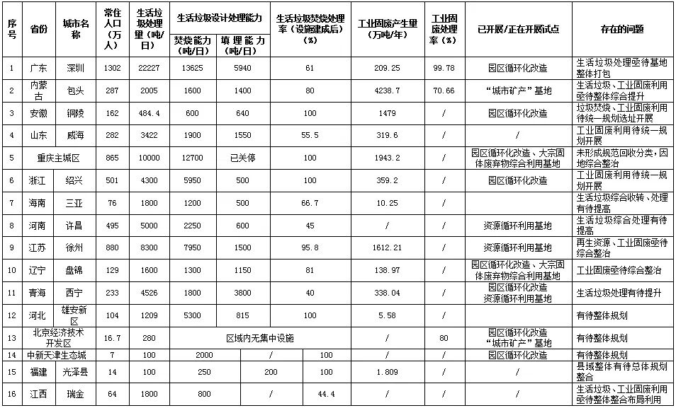 表1 “無廢城市”11+5試點固廢處理現狀分析