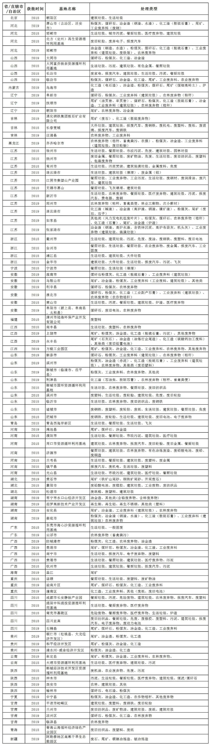 “兩型基地”的核心目標是固體廢物源頭減量、資源化利用和無害化處理,這也是“無廢城市”建設的重要內容。因此,“兩型基地”建設是實現“無廢城市”目標的重要抓手。目前,國家發展改革委累計批復了100個“兩型基地”試點,圍繞城市生活垃圾、再生資源與行業大宗固體廢棄物開展集中綜合利用試點基地建設,基地清單及處理廢棄物類型見表2。