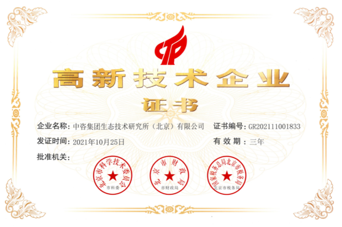中咨生態技術研究所榮獲北京市高新技術企業證書