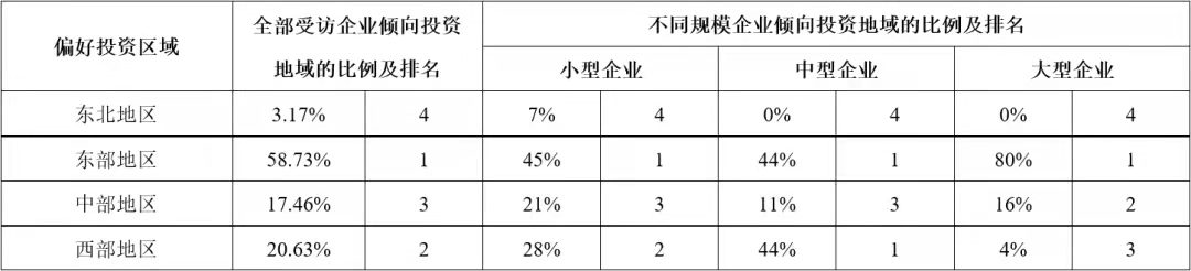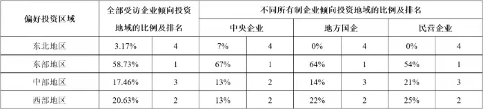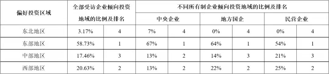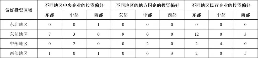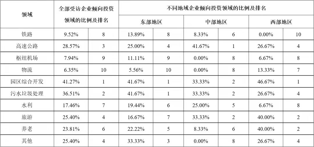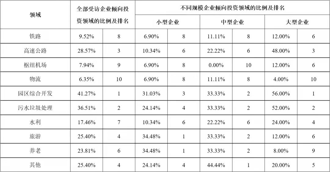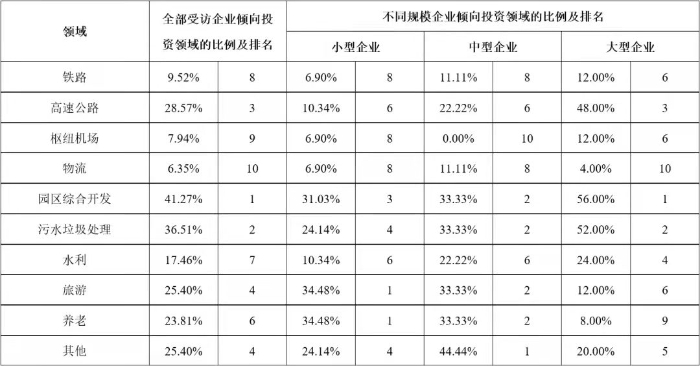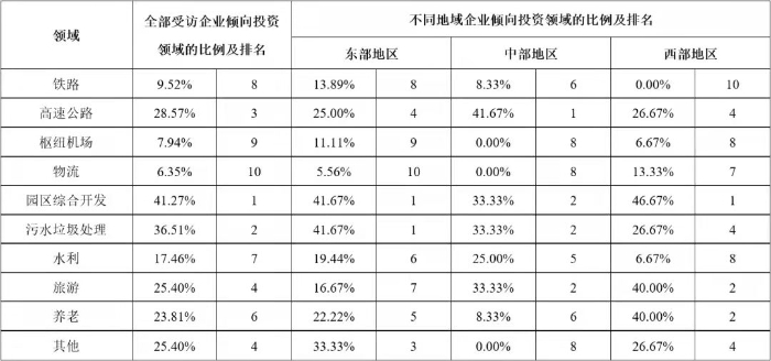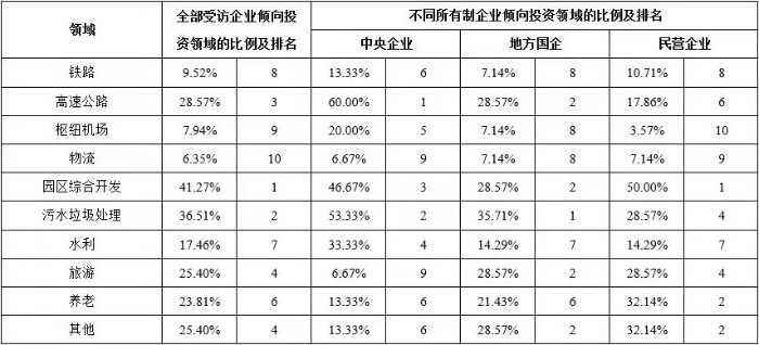 以凱恩斯為代表的傳統西方經濟學家,一直以來都強調政府在基礎設施建設供給中的重要地位。但隨著各國民間資本的發展以及基礎設施建設需求的不斷增加,基礎設施完全由政府供給的傳統理論受到挑戰。引入社會資本參與我國基礎設施領域的投資建設,是我國40年投融資體制改革與創新歷程中的重要成果,為新時代基礎設施高質量發展、促進有效投資做出了重要貢獻,也為世界基礎設施建設供給的理論與實踐講述了中國故事。 公司研究中心在多年相關專題研究與專項評估工作的基礎上,在有關各方的支持下,成立了以伍迪、牛耘詩、張雪飛、苗雨菲、馮珂、蘇靖丹、陳海清、周秘等內外部青年專家為骨干的“民間資本投資基礎設施”專題研究小組,自2019年起在各級政府部門、工程企業、學術團體、咨詢單位、金融機構等實施了多輪專項調研,先后獲得了168份調研數據資料,并基于調研數據對投資環境、投資偏好、資本結構、制約因素、政策有效性等多個方面開展了研究。本公眾號將部分研究成果以系列文章的形式陸續刊發,本文為系列研究之一,供業界同仁參考。 不同類型企業投資基礎設施項目的偏好差異研究 摘要:企業參與投資能夠促進我國基礎設施發展。基于調研數據,從領域和區域兩方面,對我國不同類型企業投資基礎設施項目的偏好差異進行對比分析,發現企業的所有制類型、主營業務所在地、企業規模等方面對企業的投資偏好產生影響,總結不同類型企業的投資偏好特點,分析偏好產生差異的深層原因,并給出政策建議。 關鍵詞:基礎設施;企業類型;投資偏好;補短板 一、研究背景 改革開放以來,我國全社會固定資產投資保持高速增長,1982年至2018年間平均增長率為20.4%。基礎設施是社會生產和居民生活提供公共服務的物質工程設施,是全社會固定資產投資的重要組成部分,是實現經濟快速持續增長的重要推動力。但是2018年以來,我國基礎設施投資連續兩年增長率僅為3.8%,內外部環境的變化為基礎設施領域投資建設帶來新的挑戰。 企業參與基礎設施投資,既能緩解政府資金壓力,又能通過市場化方式引入專業化的建設、運營和管理經驗,能夠有效拓展建設項目范圍,打破行業壟斷機制,對促進基礎設施高質量發展、國民經濟健康穩定增長具有重要意義。 我國實行以公有制為主體、多種所有制經濟共同發展的基本經濟制度,各種類型的企業都可以平等地參與基礎設施項目。但是,不同類型的企業對基礎設施項目存在不同的投資偏好,這種偏好的差異體現在行業領域、空間區域等方面,產生這些差異的原因除了企業的所有制屬性不同,還包括企業的規模、企業所在地等因素。因此,本研究對不同類型的企業進行行業領域和空間區域方面投資偏好的調研,并對不同投資偏好的差異進行分析,為促進企業參與基礎設施領域的有效投資以及相關政策的制定提供借鑒。 二、調研設計與實施 基于研究目標,本次調研重點調查企業的類型特征和投資偏好兩部分內容:企業的類型是企業的客觀信息,包括企業的所有制屬性、企業規模、所在區域等;企業的投資偏好則是企業基于自身狀況的戰略定位,包括行業領域、區域等投資偏好,具有一定的主觀性,因此要求調研的受訪對象一定是充分了解所在企業戰略和投資情況等的中高層管理人員。 本文研究團隊于2019年11月至2020年2月期間參與某中央預算內資金的專項工作,通過全國各級政府投資主管部門邀請到來自63家企業的管理人員參與本次調研。這些企業的所有制類型、主營業務所在地、企業規模分布如圖1、圖2、圖3所示,可以看出,本次調研的受訪企業具有較強的多樣性,在不同類型特征中的分布滿足本文研究要求。 三、投資領域偏好的調研結果與分析 為了提升研究的實踐指導意義,本次調研對各受訪企業的投資領域選擇范圍進行了明確的限定,即在2018年國務院發布的《關于保持基礎設施領域補短板力度的指導意見》中提到的“補短板”領域中進行選擇,具體細分為鐵路、高速公路、樞紐機場、物流、園區綜合開發、污水垃圾處理、水利、旅游、養老及其他等多個領域,調研中邀請受訪企業選擇不多于三個本企業傾向投資的領域。 調研結果顯示,企業投資領域偏好中最高的三個領域是園區綜合開發、污水垃圾處理、高速公路,這表明我國近年來城鎮化和環保領域高速發展,園區開發、污水垃圾處理項目建設扶持力度大、市場需求高,高速公路網建設也處于高速發展期。此外,旅游、養老項目作為熱門領域,也吸引了較多企業。而企業投資意向較低的領域包括物流、樞紐機場、鐵路等,這些領域往往投資規模較大、專業化程度較高,企業投資意愿相對較弱。 企業對不同領域的投資偏好有很多影響因素,以下分別對企業所有制類型、企業主營業務所在地、企業規模等因素進行分析。 (一)不同所有制企業的投資領域偏好差異分析 中央企業、地方國企、民營企業等不同所有制類型的企業對投資領域的偏好存在差異,調研結果統計如表1所示。 表1 不同所有制類型受訪企業投資領域偏好 最吸引中央企業投資的領域包括高速公路、污水垃圾處理、園區綜合開發,與所有企業的整體偏好領域相同,但具體排名有一定差異。相比于平均水平,中央企業的偏好差異主要體現在高速公路、旅游、養老等領域:傾向投資高