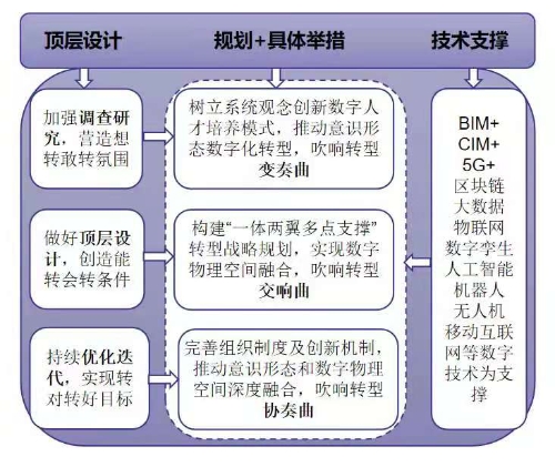 數字化時代建筑業轉型升級路徑探究 劉建春 張興宇 寧海龍 摘要:在數字經濟時代,全球企業都在謀劃未來發展大計,數字化轉型升級既是戰略性選擇,又是企業可持續發展的必經之路。建筑業作為國民經濟支柱產業,存在盈利能力低、運營效率低、信息化覆蓋率低、產業“碎片化”、基礎薄弱、產業鏈水平低、核心競爭力不強、改革力度不夠以及創新體系割裂等問題,建筑業的轉型升級迫在眉睫。本文從數字技術與建筑產業融合創新角度出發,深入分析建筑業數字化轉型路徑,創新數字化轉型新理念新內涵,構建“一體兩翼多點支撐”轉型戰略體系,將數字化作為一種手段和思維方式,建立現代企業制度,強化數字科技創新,提升數字化、精細化管理水平,推動數字化轉型升級,為實現建筑業高質量可持續發展奠定基礎。 關鍵詞:數字化;數字技術;數字化轉型;數字建造 當今世界正經歷百年未有之大變局,科技革命和產業變革日新月異,區塊鏈、大數據、云計算、人工智能、物聯網等數字技術的深化應用,深刻改變著人類生產生活方式,對經濟社會發展、人類文明進程影響深遠。在數字經濟時代,全球企業都在謀劃未來發展大計,數字化轉型升級既是戰略性選擇,又是企業可持續發展的必經之路。我國高度重視發展數字經濟,黨的十九屆五中全會提出發展數字經濟、建設數字中國,積極推進數字產業化、產業數字化,引導數字經濟和實體經濟深度融合,推動經濟健康可持續發展。堅持創新驅動發展,全面塑造發展新優勢,加快數字化發展,為全面塑造發展新優勢提供持續動力,依靠數字技術的創新驅動,不斷培育新產業、新業態、新模式,催生新動能、推動新發展。加快推動數字化轉型,已經成為深化供給側結構性改革,實現高質量可持續發展的重點和關鍵。 在數字化變革的大趨勢下,作為國民經濟支柱產業的建筑業在政府監管、招投標管理、工程組織方式、建筑用工制度等方面進行了改革與創新,尤其是建筑信息模型(Building Information Modeling.BIM)和城市信息模型(City Information Modeling. CIM)技術的應用及裝配式建筑的發展,極大地提升了建筑業現代化水平。2020年,我國實現建筑業總產值26.39萬億元,同比增長6.24%,占國內生產總值比重26.13%。建筑業從業人數5366.92萬人,占全社會就業人員總數的6.68%,建筑業在推進新型城鎮化建設、吸納就業及維護社會穩定等方面發揮顯著作用[1]。但同時,建筑業還面臨盈利能力低、運營效率低、信息化率(信息化覆蓋率)低、環境污染嚴重、核心競爭力不強、改革力度不夠以及創新能力不足等問題,建筑業的轉型升級迫在眉睫。鑒于此,建筑業需要將數字化作為一種手段和思維方式,深化改革,建立現代企業制度,提升精細化管理水平,創新商業模式,推動數字化轉型升級,從而實現建筑業高質量可持續發展。 一、推動建筑業轉型升級的必要性 (一)轉型升級是推進高質量發展的必然要求 建筑業主營業務單一,發展方式粗放,水泥、鋼鐵等建筑材料資源消耗嚴重,廢水、廢渣等環境污染嚴重,能源消耗偏高、勞動力成本偏高、工人技能偏低、建筑工業化水平較低等問題凸顯。政府監管體制及市場信用配套機制不健全,工程質量問題與安全事故、違規違法行為時有發生。同時,兩級分化越來越嚴重,一方面是建筑央企占市場份額越來越高,2020年,中國建筑、中國中鐵等7大建筑央企占市場份額比重超過1/3,強者愈強;另一方面則是弱者恒弱,數量龐大的其他建筑業與建筑央企的差距越來越大。因此,要推進高質量發展,必須要實現轉型升級,由單一主業轉向多元經營,大力發展綠色建筑、智能建筑及裝配式建筑,推動智慧城市、新基建等國家戰略落地實施,實現高質量發展。 (二)轉型升級是提升核心競爭力的必然要求 首先,對標發達國家建筑業,國內大部分建筑業在管理體制、經營理念、數字化建設等核心競爭力方面,與美國、日本、法國等發達國家建筑業還存在較大差距。其次,從自身發展看,建筑企業產權結構單一,國有股份比重大,受限于體制機制的約束,現代企業制度不完善,市場意識不夠,競爭意識較差,缺乏積極性和主動性。最后,從市場規模看,建筑業總產值雖然持續增長,但增速總體呈下降趨勢,2020年建筑業總產值增速6.24%,相比2017年、2018年分別降低了4.29、3.64個百分點。國家基礎設施建設增長速度趨于平穩發展狀態,工程建設規模面臨收縮趨勢,建筑市場將因沒有明顯增量導致的競爭進一步加劇。因此,依托數字技術手段推動企業轉型升級,深化企業改革,提升核心競爭力,助力構建雙循環發展新格局,拓展新興業務市場和海外市場將是建筑業未來重點發展方向,也是必然選擇。 (三)轉型升級是提升盈利能力的必然要求 建筑行業較其他行業盈利能力差。2020年,建筑業產值利潤率為3.15%,連續四年下降,相當于工業產值利潤率的一半,相當于日本等發達國家建筑業產值利潤率的一半。我國建筑施工企業信息化投入占總產值的比例約為0.08%,發達國家則為1%;我國建筑業信息化率約為0.03%,國際平均水平為0.3%,兩者相比差距都在10倍左右。基于2020年我國建筑業總產值26.39萬億元測算,信息化率每提升0.1個百分點就將帶來近263.9億元的增量市場,未來提升空間巨大。2020年我國建筑信息化市場規模約為380億元,按照年復合增長率25.66%計算,2025年將超過1200億元。由此可見,通