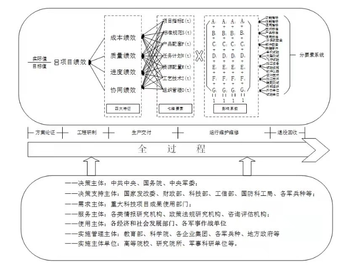 基于基礎信息要素的重大科技工程項目全過程管理及績效評價研究 中國國際工程咨詢有限公司 武博祎 哈爾濱工程大學 陳茜、蘆翰晨、陳俊清 摘要:文章基于系統工程、綜合集成等相關理論,堅持需求導向,從重大科技工程項目落實全要素、全過程軍民融合和協同創新,以及對重大科技工程項目實施科學和精細化管理出發,將重大科技工程項目所表現和涉及的基礎要素按如下七個維度進行劃分:項目技術指標E(t)、項目標準規范S(t)、產品配套結構P(t)、保障資源配置R(t)、制造工藝技術I(t)、項目任務計劃W(t)、組織管理效能O(t),并提出各維度要素及項目成本、質量、進度、協同四大特征與整個工程項目績效評價方法,以便實現重大科技工程項目全要素、全過程動態集成管理和績效評價,為科學決策提供支持。 關鍵詞:重大科技工程項目;要素;集成管理;績效評價 一、引言 為提升國家戰略實力,增強自身競爭優勢,包括美國、俄羅斯、日本、印度、歐洲等國家和地區都積極組織實施集工程研制、科學研究和能力建設目標為一體、軍民融合的重大科技工程項目。為實現我國戰略發展目標,國家2006年2月發布《國家中長期科學和技術發展規劃綱要(2006-2020)》[1],確定了關系國計民生的16個重大專項;2017年科技部啟動了“科技創新2030-重大項目”,對重大科技工程項目進行布局。這些重大科技工程項目的實施,對解決國家安全重大問題,推動科技進步,服務經濟社會發展,提升產業整體競爭力,增強綜合國力具有重大戰略意義。 重大科技工程項目是集科學層次理論研究與核心技術突破、技術層次資源集成與開發實施、工程層次產品(設施)研制于一體,且具有軍民融合屬性的復雜巨系統[2]。具有實施周期長、投資大、領域廣、風險高等特點,需要各參研參建單位資源共享、協同創新,各相關主體對項目涉及的要素進行科學和精細化管理,才能完成項目既定目標,并使軍民融合和科技協同創新戰略得以貫徹落實。但從現實情況看,目前我國重大科技工程項目管理仍普遍采用上世紀50年代美國項目管理協會提出的項目管理方法,重點關注項目進度、成本和質量等中觀特征要素,對影響項目預算變化、進度調整、質量保證等問題,特別是項目深度軍民融合效能問題,缺乏有針對性的基礎信息要素分析和管理。因此,在國家要求在相關領域實現全要素軍民融合深度發展的大背景下,如何在一定的約束條件下對重大科技工程項目組織實施科學、精細和動態管理,并使其實現既定目標,是一個重要且急需解決的問題。 我國現行基于美國上世紀提出的項目管理理論制定的針對科技工程項目管理方法,一直以來對項目管理取得了積極的成效,但隨著人們認知自然世界的不斷深入、所面臨問題的不斷變化、對重大科技工程項目管理要求的提高,需要有能夠全面、系統、量化、精細反映重大科技工程項目本質運動狀態的管理方法,以便對項目實施的變化趨勢、項目目標實現可能遇到的風險進行準確分析判斷,適應管理的科學化、系統化、精準化、協同化要求。因此,本文通過剖析重大科技工程項目基礎信息要素,構建基于信息要素的績效評價體系,實現全要素、全過程的科學化、系統化、知識化、精準化、準實時動態管理,具有一定的理論和實際應用意義。 二、重大科技工程項目管理研究現狀 重大科技工程項目全要素、全過程管理研究目前處于起步階段,研究成果相對較少,研究的視角主要集中在從國家宏觀層面及微觀重大科技工程項目過程管理兩方面開展研究。 宏觀角度研究重大科技工程項目管理的目的在于為其培育較好環境,完善相關政策,優化重大科技工程項目資源配置,推動重大科技工程項目成功實施。國家為項目的實施能夠達到預期的目標,對重大科技工程項目制定相關的政策、法規及激勵、評價、審核機制,建立與重大科技工程項目全壽命周期相匹配的管理制度和方法,針對項目方案論證、工程研制、生產交付、運行維護維修和退役回收等相應階段[3],確定各環節里程碑并予以制約、管制,建立有效監督機制加強對重大科技工程項目宏觀管理?;诖?,學者在監督機制建立[4]、重大科技工程項目評價[5]、國內外重大科技工程項目管理等方面開展了相關研究。 微觀角度研究重大科技工程項目主要以項目全壽命周期過程管理為對象[6]。重大科技工程項目是一開放復雜巨系統,具有投資規模大、實施周期長[7]、技術風險高、參與單位多、專業領域廣、任務層級多、管理任務重等內在特點,對項目的過程管理提出了更新、更高的要求。諸多學者致力于研究相應方式方法,使過程管理綜合集成遵循某種法則,通過約定項目信息傳遞方式、組織管理規范,使項目管理呈現有序和統一狀態。目前,重大科技工程項目過程管理主要從界面管理、知識管理、創新工程三個角度展開研究。從界面管理角度展開研究的學者認為界面為各子系統之間相互區別又相互聯系的紐帶[8],只有做好橫向眾多參與單位之間接口及縱向實施過程各階段接口管理工作,才能使重大科技工程項目實現資源最優配置,完成重大科技工程項目目標,學者主要從合作界面及組織界面兩個維度展開研究,進行關鍵界面識別及研究整合優化方法。從知識管理角度開展研究的學者認為,知識是重大科技工程項目實施過程中流動的“血