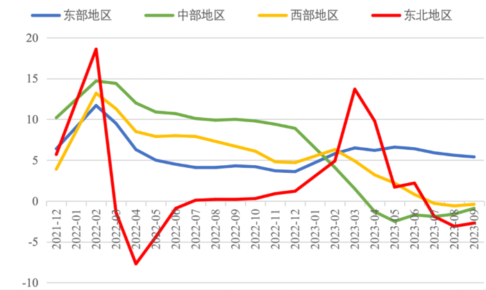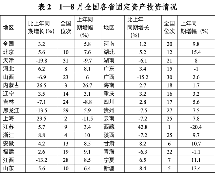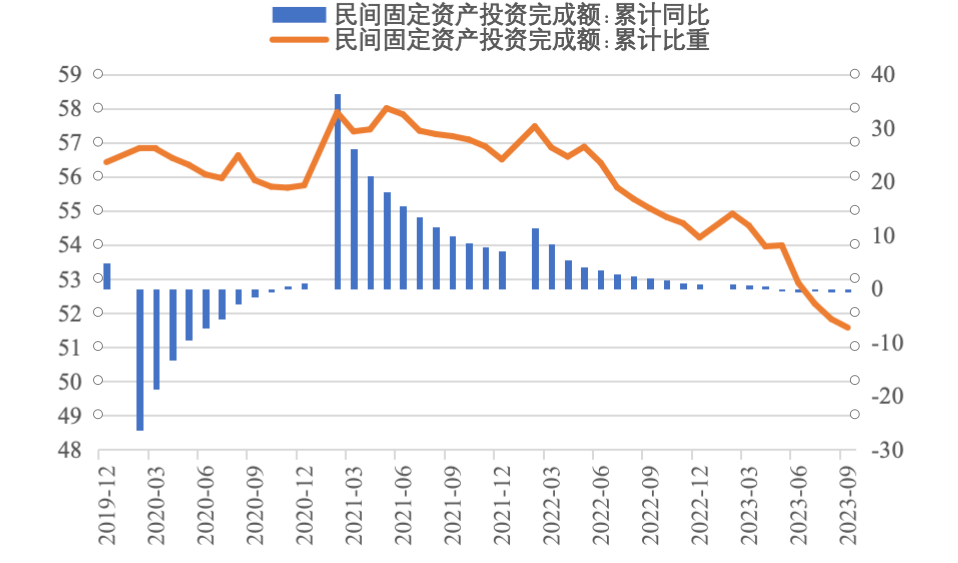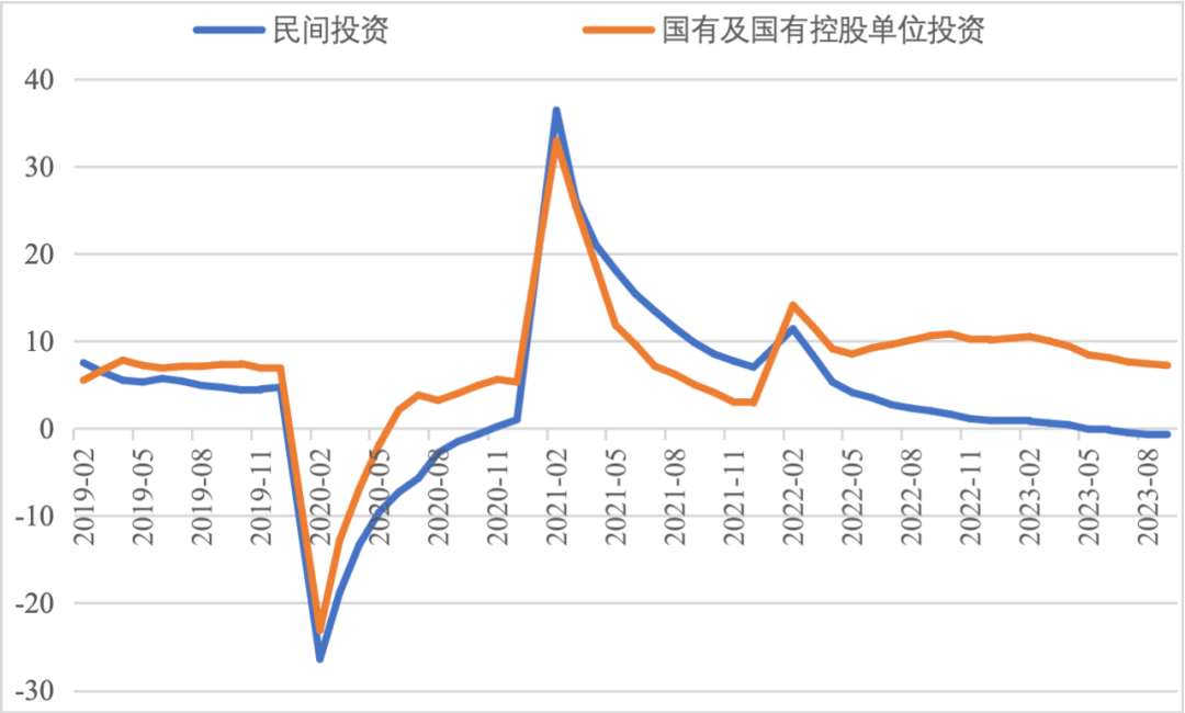 2023年前三季度,我國經濟運行持續恢復向好,投資對優化供給結構的關鍵作用顯著增強,高技術產業投資保持較快增長,基礎設施投資、制造業投資穩投資支撐作用進一步發揮。同時,當前穩投資也面臨新的困難挑戰,尤其是房地產市場深度調整導致房地產開發投資和民間投資承受較大下行壓力。下一步仍需精準有力加強逆周期調控,不斷拓展促投資政策空間,重點圍繞提振房地產市場、推動制造業轉型升級、激發民間投資活力等方面,繼續夯實投資復蘇基礎。 一、固定資產投資整體運行情況 (一)整體投資保持平穩增長態勢 2023年1—9月,我國固定資產投資(不含農戶,下同)375035億元,同比增長3.1%,較國內生產總值增速低了2.1個百分點,較上半年增速低了0.7個百分點,固定資產投資增速持續放緩。從投資構成看,上半年建安工程、設備工器具購置、其他費用分別增長2.4%、6.8%、3.1%。設備工器具購置保持較快增長,反映在各類政策工具支持引導下,企業設備購置、技術改造投入力度加大。 圖1 全國固定資產投資增速(%) 數據來源:國家統計局 (二)民間投資意愿和能力仍待恢復 2023年1—9月,民間固定資產投資為193399億元,同比下降0.6%,較上半年低了0.4個百分點,低于投資整體增速3.7個百分點。從季度波動看,民間固定資產投資的增速由2022年第一季度的8.4%持續下滑,并連續兩個季度負增長。民間固定資產投資占比進一步萎縮,跌至2011年以來的最低點,僅為51.57%。 圖2 民間投資增速及占比(%) 數據來源:國家統計局,Wind數據庫 國家統計局發布信息顯示,房地產投資中約80%為民間投資。受房地產市場深度調整影響,民間投資動力和能力相對不足,國有及國有控股單位投資增速連續20個月高于民間投資增速。2023年1—9月,國有及國有控股單位同比增長7.2%,較民間投資增速高了7.8個百分點。 圖3 民間投資、國有及國有控股單位投資增速(%) 數據來源:國家統計局,Wind數據庫 (三)制造業投資保持較快增長,基礎設施補短板投入加大 2023年1—9月,制造業和基建投資保持較快增長,房地產投資持續負增長,且降幅有所擴大。基礎設施投資在專項債等融資支持政策以及重大項目支撐下,效果持續顯現,前三季度基礎設施投資同比增長8.64%,高于全部投資5.54個百分點,是三大類投資中增長最快的領域。其中,鐵路運輸業、倉儲業投資分別大幅增長22.1%、27.7%。截至9月底,新增地方政府專項債已發行超過3.1萬億元,完成全年專項債額度的80%以上,對基礎設施投資形成較強支撐。1—9月份,計劃總投資億元及以上項目投資同比增長10.2%,較1—8月快了0.3個百分點,對全部投資增長的貢獻率達169.2%,大項目投資帶動作用明顯。 數據來源:國家統計局,Wind數據庫 2023年1—9月,制造業投資同比增長6.2%,比整體投資高3.1個百分點。其中,高技術制造業投資同比增長11.3%,對制造業投資拉動作用明顯,表明我國制造業加速轉型升級。9月,制造業采購經理指數(PMI)為50.2%,比上月上升0.5個百分點,重返擴張區間。生產指數和新訂單指數均高于臨界點,分別為52.7%和50.5%,表明制造業生產和市場需求穩步回升。裝備制造業、高技術制造業PMI分別為50.6%、50.1%,均位于擴張區間。從企業規??矗?、中、小型企業PMI分別為51.6%、49.6%和48%,其中大型企業PMI較上月回升0.8個百分點,為近6個月高點,表現出強勁恢復發展動能。 圖4:制造業PMI指數(%) 數據來源:國家統計局,Wind數據庫 2023年1—9月,房地產開發投資增速持續放緩,房地產開發投資、住宅開發投資分別同比下降9.1%、8.4%。房地產開發投資占固定資產投資完成額的比重降至23.3%,較上半年下降0.8個百分點,為今年以來最低值。房屋施工面積、房屋新開工面積等先行指標均出現明顯下滑,分別同比下降7.1%、23.4%。1—9月,國房景氣指數均位于100以下,自4月以來持續走低。 圖5 三大領域固定資產投資增速(累計同比,%) 數據來源:國家統計局,Wind數據庫 (四)東部地區投資保持較快增長,東北地區投資下滑明顯 從投資地域看,三季度東北地區投資轉為負增長,1—9月累計同比下降2.7%,較全國水平低了5.8個百分點。東部地區投資同比增長5.4%,保持較高增速。西部地區投資同比微降0.4%,增速由正轉負。中部地區投資同比下降0.9%,降幅較上半年收窄0.8個百分點。 圖6 分地區固定資產投資增速(累計同比,%) 數據來源:國家統計局,Wind數據庫 1—8月,31個省份中有15個省投資增速高于全國水平,其中西藏、上海、內蒙古等3省實現兩位數增長,增速分別達42.8%、29.5%、26.5%,投資恢復動力較強。天津、山西、吉林、黑龍江、江西、山東、湖南、廣西、貴州、云南、陜西、青海等12省出現負增長,其中天津、廣西、黑龍江、江西降幅最大,分別同比下降19.8%、15.2%、13.5%、13.2%。 數據來源:國家統計局,Wind數據庫 二、主要問題 (一)房地產投資持續低迷加劇市場信用風險 一是房企信用風險增加制約融資能力。房企普遍采取的高負債、高周轉運營模式,積累了較高的杠桿風險,房地產開發項目存量資產普遍存在融資抵押且抵押率較高的情況,導致房地產債務重組等風險化解方式推進困難,房企的信用修復過程緩慢,進一步導致融資困難。1—9月,房地產開發企業國內貸款和自籌資金分別同比下降11.1%和21.8%。二是房企流動性風險向產業鏈上下游傳導。房地產業涉及行業多、產業鏈條長,行業不景氣間接拖累了上下游民營企業投資。恒大、碧