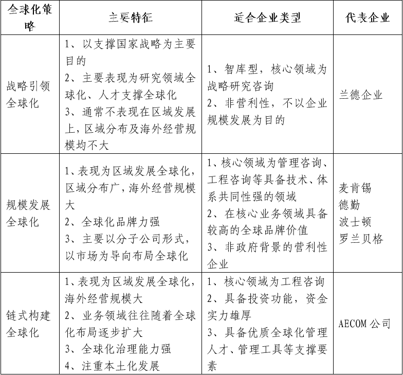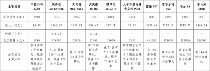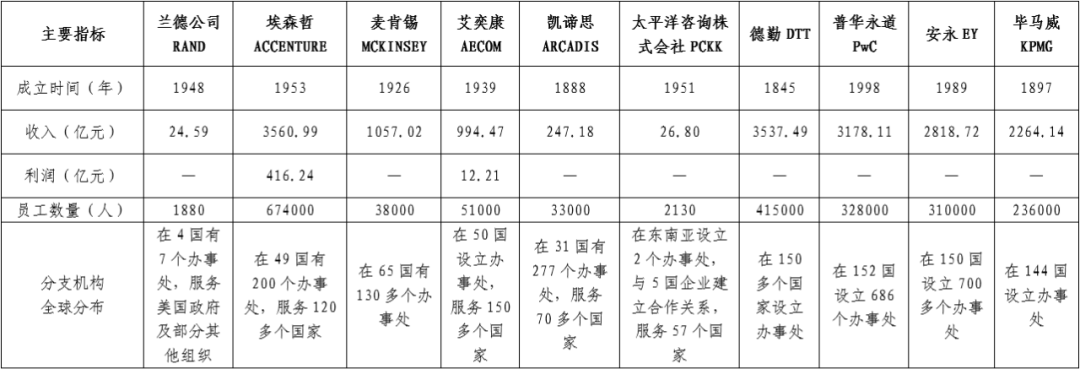 中咨公司與世界一流咨詢企業對比研究 中咨公司“青馬工程”第四小組 陳佳鵬 譚瀟 王晶晶 等 一、研究背景 (一)研究目的 黨的二十大報告提出,要“深化國資國企改革,加快國有經濟布局優化和結構調整,推動國有資本和國有企業做強做優做大,提升企業核心競爭力”“完善中國特色現代企業制度,弘揚企業家精神,加快建設世界一流企業”,這些都為國資國企以實際行動全面建設社會主義現代化國家、以中國式現代化推進中華民族偉大復興提供了根本遵循。 《國企改革三年行動方案(2020-2022年)》和《關于開展對標世界一流管理提升行動的通知》(國資發改革〔2020〕39號),要求中央企業要對標世界一流企業,通過管理提升,建設成為具有全球競爭力的企業。中國國際工程咨詢有限公司(以下簡稱中咨公司)“十四五”規劃明確提出,未來發展要聚焦于實現建成國家高端智庫和世界一流咨詢機構的戰略目標,指明了公司的前進方向。 為深入貫徹黨的二十大報告關于國資國企改革發展和黨的建設的重大部署,認真落實國務院國資委關于中央企業對標世界一流管理提升改革行動計劃的相關部署和中咨公司“十四五”發展規劃,以推動公司高質量發展為主題,以改革創新為根本動力,緊扣“加快建設世界一流咨詢機構”目標,通過選取咨詢領域有較強影響力的標桿企業開展對比研究,提出中咨公司建設世界一流咨詢機構的戰略構想,進一步搶抓高質量發展的重要戰略機遇期。 (二)對比范圍 基于中咨公司業務范圍與自身戰略規劃,本次研究將重點選取全球領先的智庫型企業、管理咨詢企業、工程咨詢企業進行對比研究。 表1 三類咨詢企業分類一覽表 (三)研究思路 重點圍繞經營規模、全球戰略布局、集團化發展、數字化發展、人才培養等方面開展對比研究,為中咨公司打造世界一流咨詢機構提出初步的方向性戰略構想,更好地服務公司高質量發展總體戰略。充分發揮龍頭示范作用,加強精細化管理,全面提升核心競爭力,助力中咨公司加快建設成為國內有權威、國際有影響的國家高端智庫、世界一流咨詢機構,體現智庫型中央企業的使命擔當。 二、經營規模現狀分析 (一)對比企業經營規模情況 1.智庫型企業 蘭德公司(RAND)是全球頂級智庫型企業之一。蘭德公司成立于1948年,總部設在美國加利福尼亞州的圣莫尼卡,是國際最知名的非營利性的研究機構之一,被譽為現代智囊的“大腦集中營”“超級軍事學院”,致力于以嚴謹的分析研究來推進決策與政策制定。擁有來自50多個國家的1880多名員工,半數以上的研究人員持有一個或多個博士學位,在2020年全球頂級智庫綜合榜單中排名第七,2021年總收入為24.59億元(折人民幣)。 業務領域范圍較廣。蘭德公司資金來源廣泛,目前軍隊、政府的資助仍然超過一半以上。蘭德公司主要為美國軍方、美國政府機構、基金會、高校以及私營企業等提供咨詢服務,研究領域主要涉及軍事科技、國家安全、國際事務、公共安全、法律與商業、教育、健康、基礎設施、交通、能源、環境、網絡通訊、數據科學、社會公平等。 2.管理咨詢企業 埃森哲(ACCENTURE)。埃森哲成立于1953年,是一家全球領先的專業服務公司,在數字化、云計算與網絡安全領域擁有全球領先的能力。埃森哲秉承“科技融靈智,匠心承未來”的企業使命,致力于通過引領變革創造價值,為客戶、員工、股東、合作伙伴與整個社會創造美好未來。埃森哲憑借獨特的業內經驗與專業技能,以及翹楚全球的卓越技術中心和智能運營中心,為客戶提供戰略和咨詢、互動體驗、技術服務和智能運營等全方位服務,業務涵蓋40多個行業,以及企業日常運營部門的各個職能。埃森哲是《財富》全球500強企業之一,在全球49個國家設立了200多個辦事處,服務于120多個國家的客戶,擁有674000多名員工,2021年總收入為3560.99億元(折人民幣)。 麥肯錫(MCKINSEY)。麥肯錫成立于1926年,其定位是幫助領先的企業機構實現顯著、持久的經營業績改善,打造能夠吸引、培育和激勵杰出人才的優秀組織機構。主營業務是為客戶特別是企業設計、制定相配套的一體化解決方案,包括戰略開發、經營運作、組織結構等,業務范圍涉及汽車、銀行、能源、保健、保險、制造、公共事業、零售、電信和交通等領域。目前擁有來自80多個國家38000多名員工,2021年總收入為1057.02億元(折人民幣)。 德勤(DTT)。德勤成立于1845年,是全球領先的專業服務機構,世界四大會計師事務所之一。德勤品牌連續第四年被Brand Finance(品牌金融)評為全球最具影響力及最具價值商業服務品牌,入選全球最佳雇主榜單,為近90%的《財富》全球500強企業以及數千家民營企業提供專業服務。德勤業務范圍包括審計和鑒證、稅務和法律、咨詢、財務咨詢和風險咨詢服務等,涉及消費品行業、能源、資源與工業、金融服務、政府與公共服務、生命科學與醫療保健、技術、媒體與電信等領域。德勤在全球150多個國家設立辦事處,擁有415000多名員工,2021年總收入為3537.49億元(折人民幣)。 普華永道(PwC)。普華永道成立于1998年,是一家致力于“在社會中建立信任并解決重要問題”的全球專業服務聯盟組織。在中國注冊會計師協會《2021年度會計師事務所綜合評價百家排名信息》中,普華永道連續第十九年(2003年~2021年)蟬聯該項排名第一。普華永道主營業務包括