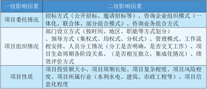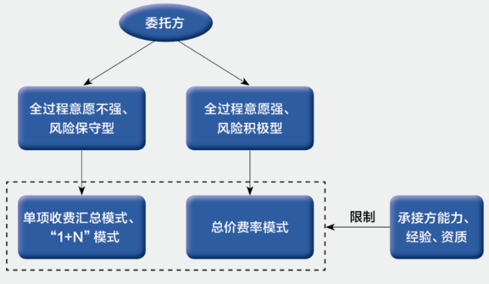 摘要:隨著我國基礎設施規模逐漸擴大,對效率要求極高的規模化、集群化、復雜化的建設工程大量出現,傳統分階段咨詢模式已經不能滿足這類項目的需求,全過程工程咨詢模式開始進入人們的視野。我國全過程工程咨詢服務處于起步階段,缺乏完善的體系和標準,尤其在酬金計取上缺乏參考依據。本文通過問卷調研、專家打分等形式對全過程工程咨詢酬金計取方式影響因素進行研究,識別影響計費方式的重要因素,為全過程工程咨詢服務實踐中計費模式選取提供參考。 關鍵詞:全過程工程咨詢;計費模式;影響因素 全過程工程咨詢服務是指由咨詢公司為業主提供涵蓋工程全業務、全生命周期、全方面的咨詢服務方案。全過程工程咨詢是從各專項咨詢業務基礎上發展而來,但并非各階段工程咨詢業務的簡單組合,是各環節有機整合,系統性思想貫穿其中,相較于傳統咨詢模式,具有節約投資成本、縮短項目工期、提高服務質量等優勢。 我國目前全過程工程咨詢發展仍處于起步階段,企業推行過程中面臨不少困境,其中一個問題就是收費體系的不健全、不完善,計費模式選擇缺乏參考依據。目前各企業主要采取單項收費匯總、總價費率、人工工時、“1+N”計費四種收費模式,而具體選擇哪一種模式并沒有相應的標準,計費問題是咨詢項目從委托到落實過程中不可避免的重要問題,針對不同的項目,計費模式的選擇不能一概而論,生搬硬套以往經驗,最終模式的確定是政策環境、項目實際情況等多種因素綜合考量的結果。 計費模式影響因素研究可以識別與計費模式相關聯的重要因素,企業實踐中能更有針對性地對這些因素進行綜合考量,為決策過程提供依據,提高決策的科學性。本文以全過程工程咨詢計費選擇影響因素為研究對象,通過文獻調研、政策分析等形式得到影響全過程工程咨詢計費模式選擇的8個一級影響因素以及相應的31個二級影響因素,并通過專家打分得到各個因素之間的重要性關系,最后從影響因素視角給出計費模式選擇建議,為企業實踐提供依據,豐富了全過程工程咨詢計費理論研究,為相關政策制定提供一定參考。 一、我國全過程工程咨詢服務酬金計取方式影響因素識別 根據文獻梳理和相關政策分析,綜合考慮全過程工程咨詢項目內外部環境,本文從外部環境、項目本身、利益相關者、計費方式四個層面出發,對全過程工程咨詢酬金計取方式產生影響的因素進行了分析。 (一)外部環境層面 從外部環境層面來看,對于全過程工程咨詢項目,每個地方的政策以及當地政府的支持措施有所不同,可能會影響企業關于酬金計取方式的選擇傾向,同時進行具體的費用核算時必須考慮到市場行情和當地的物價水平,對于人工工時這類計費模式更是依賴于各地方發展狀況和物價水平。另一方面,從咨詢行業來看,目前全過程工程咨詢計費模式選擇沒有統一的標準,企業進行選擇要參照行業現有的實踐情況,現有各類計費標準的完善程度也是企業決策時的重要依據。 表1 外部環境層面可能影響因素 資料來源:作者根據公開資料整理 (二)項目本身層面 從項目本身層面來看,招標方式、組織模式等項目委托情況可能會對計費模式選擇造成影響,公開招標、邀請招標或者總體招標、分階段招標等招標形式會對交易費用產生影響,企業選擇一體化或聯合體等組織模式以及選擇哪些咨詢業務進行外包都可能影響后續的計費模式選擇。項目的組織情況例如部門設立的方式、領導方式等會影響整個項目的架構和協調性,是按照職能還是時間進行部門劃分,采用集權式或分權式管理,項目人員分工是否存在交叉,項目生命周期各階段業務之間是否有較高獨立性等情況都會影響到整個項目的集成或分散程度,計費模式選擇要與項目各方面安排相配合。從項目本身性質來看,不同項目所屬行業不同,項目周期以及整個工程面臨的復雜程度和風險程度也不同,計費模式選擇要能夠覆蓋項目的投入成本,反映出項目的性質特點,一概而論必然會造成最終費用偏高或偏低等不合理現象發生。 表2 項目層面可能影響因素 資料來源:作者根據公開資料整理 (三)利益相關者層面 從利益相關者角度,選擇科學合理的計費模式最終是為了使項目各方的需求得以滿足,最大限度保障各方利益。項目委托方是主導者,也是咨詢業務的需求者,計費模式要考慮到委托方的需求,參考其以往合作經歷,考慮其選擇上的偏好。任何選擇都需要承擔一定的風險,委托方對于風險的態度是保守型、中立型或者積極型以及其風險承擔能力都可能影響后續計費方案的選擇??們r費率、單項收費匯總等不同酬金計取方式在實施上可能遇到的困難難以預知,承接方作為咨詢服務的提供者,要考慮其資質和能力水平盡量挑選其有把握有經驗的計費模式,盡可能使風險最小化。 表3 利益相關者層面可能影響因素 資料來源:作者根據公開資料整理 (四)計費模型本身層面 單項收費匯總、總價費率、人工工時費、“1+N”計費幾種計費模式的特點各不相同,單項收費匯總模式目前采用較多,該模式是從傳統的分階段收費模式演變而來,適合全過程咨詢經驗不足的企業在過渡期使用,造價咨詢、勘察設計等各階段的收費也有現有的標準可以參考,但實施過程中容易出現各項業務拼湊,不利于全過程工程咨詢服務模式推廣?!?+N”計費在單項收