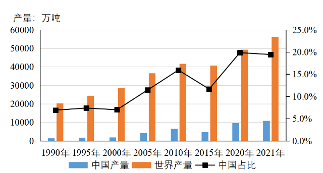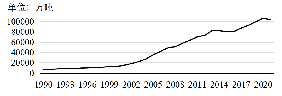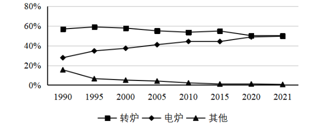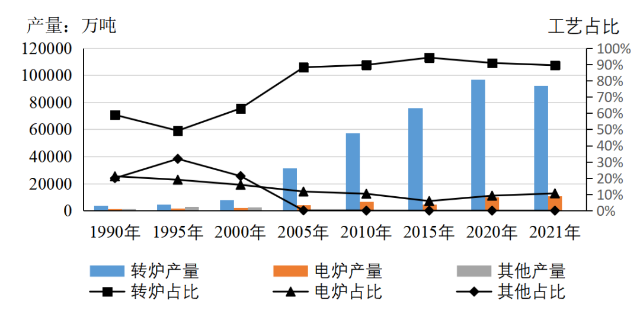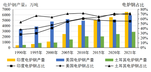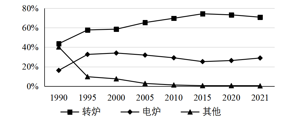 摘要:全球粗鋼產量中,長流程工藝占70%。主要產鋼國中,中國、日本、俄羅斯、韓國、德國以轉爐鋼為主,印度、美國、土耳其以電爐鋼為主。我國電爐鋼產量超過1億噸,占全球的近20%,但不同于美國、土耳其等國家,廢鋼在我國電爐鋼原料中的占比不足50%,其余為鐵水或鐵塊。未來一段時期,我國粗鋼產量將處于較高水平,雖然電爐鋼產量呈增長趨勢,但轉爐鋼仍占據優勢地位。建議加強廢鋼資源回收利用、避免電爐工藝“大躍進”、增加轉爐廢鋼使用量。 關鍵詞:鋼鐵;工藝結構;轉爐鋼;電爐鋼 鋼鐵生產工藝主要有2種,即以鐵礦石為主要原料的高爐-轉爐長流程工藝和以廢鋼為主要原料的電爐短流程工藝。長期以來,憑借原料易獲得等優勢,長流程工藝始終占據主導地位。短流程工藝工序少、投資小、能耗低、排放少,在廢鋼資源豐富、電價較低的地區具有更好的發展優勢,未來發展空間較大。分析國內外鋼鐵生產工藝結構變化情況,對研究我國鋼鐵工業生產工藝發展方向具有重要意義。 一、全球鋼鐵生產工藝結構 1.長流程始終占主導地位,短流程基本保持在30%左右 自1990年以來,轉爐鋼占全球鋼產量的比重從57%左右增長到70%左右,始終占據主導地位。電爐鋼產量占比從27%增長到2000年的34%,之后降至29%,基本保持在30%左右。以平爐裝備為代表的其他工藝鋼產量占比從16%持續下降至不足0.5%。1990年以來全球粗鋼生產工藝結構見圖1。 數據來源:世界鋼鐵協會。 圖1 1990年以來全球粗鋼生產工藝結構 2.世界主要產鋼國中,長流程鋼產量占絕對優勢 2021年,世界鋼產量超過5000萬噸的國家有6個,其中中國、日本、俄羅斯、韓國均以轉爐鋼為主,僅印度、美國以電爐鋼為主。全球前十大產鋼國2021年鋼產量16.23億噸。其中,轉爐鋼產量12.35億噸,占76.1%;電爐鋼產量3.86億噸,占23.8%;其他工藝鋼產量0.02億噸,占0.1%。2021年全球前十大產鋼國工藝結構見圖2。 數據來源:世界鋼鐵協會。 圖2 2021年全球前十大產鋼國工藝結構 3.中國鋼產量大幅增長,對全球鋼鐵生產工藝結構影響巨大 2000年-2021年,以長流程為主的中國鋼產量大幅增長,是全球電爐鋼產量占比下降的主要原因。中國鋼產量從1.3億噸快速增長至10.3億噸,占全球鋼產量的比重從15%提高至53%。中國鋼產量中,轉爐鋼占絕大部分,從2000年的0.8億噸增長至2021年的9.2億噸,占全球總產量的比重從不足10%增加到50%左右。2020年以來中 國鋼產量占全球鋼產量比重見圖3。 數據來源:世界鋼鐵協會。 圖3 2000年以來中國鋼產量占全球鋼產量比重 4.中國以外地區電爐鋼產量占比明顯增加,接近50% 1990年-2021年,中國以外地區鋼產量呈增長趨勢,從6.81億噸增長到9.17億噸,增幅34.7%。其中,轉爐鋼產量從3.87億噸增長到4.57億噸,增幅18.1%;電爐鋼產量從1.89億噸增長到4.54億噸,增幅140.2%;其他工藝鋼產量從1.05億噸減少到585萬噸,占比不足1%。電爐鋼產量占比從27.7%顯著提升至49.5%。1990年以來中國以外地區粗鋼生產工藝結構見圖4。 數據來源:世界鋼鐵協會。 圖4 1990年以來中國以外地區粗鋼生產工藝結構 二、 主要產鋼國生產工藝結構 1.印度、美國、土耳其形成了以電爐鋼為主的工藝結構 印度、美國、土耳其等國依托自身資源條件,逐步形成了以電爐鋼為主的工藝結構(見圖5)。1990年-2021年,印度電爐鋼產量從411萬噸增長到6525萬噸,增加6084萬噸,增長14.9倍;美國電爐鋼產量從3351萬噸增長到5937萬噸,增加2586萬噸,增幅77.2%;土耳其電爐鋼產量從496萬噸增長到2893萬噸,增加2397萬噸,增長4.8倍。2021年,印度、美國、土耳其電爐鋼占比分別為55.2%、69.2%、71.6%。 數據來源:世界鋼鐵協會。 圖5 印度、美國、土耳其電爐鋼產量及占比 2.日本、俄羅斯、韓國、德國保持以轉爐鋼為主的工藝結構 1990年-2021年,日本轉爐鋼、電爐鋼產量分別從7564萬噸、3470萬噸降至7194萬噸、2436萬噸,降幅分別為4.9%、29.8%。俄羅斯轉爐鋼產量從5437萬噸降至4460萬噸,降幅為18.0%;電爐鋼產量從2013萬噸增至2948萬噸,增幅為46.4%;平爐鋼產量從7985萬噸降至151萬噸,降幅為98.1%。德國轉爐鋼產量從3324萬噸降至2799萬噸,降幅為15.8%;電爐鋼產量從886萬噸增至1211萬噸,增幅為36.7%。韓國轉爐鋼、電爐鋼產量分別從1594萬噸、719萬噸增至4801萬噸、2239萬噸,增幅分別為201.2%、211.4%。除日本外,俄羅斯、韓國、德國電爐鋼產量均有較大幅度增長,但仍以轉爐鋼為主。2021年,日本、俄羅斯、韓國、德國轉爐鋼占比分別為74.7%、59.0%、68.2%、69.8%。日本、俄羅斯、韓國、德國轉爐鋼占比情況見圖6。 數據來源:世界鋼鐵協會。 圖6 日本、俄羅斯、韓國、德國轉爐鋼占比 三、 我國鋼鐵生產工藝結構 1.我國粗鋼產量快速增長,占全球鋼產量50%以上 1990年-2021年,我國粗鋼產量快速增長(見圖7),從6635萬噸增至10.33億噸,增加14.6倍;占全球粗鋼產量的比重從8.9%增至53.0%。特別是2000-2013年粗鋼產量從1.27億噸增至8.22億噸,2016-2020年粗鋼產量從8.08億噸增至10.65億噸,年均增量均在5000萬噸以上。 數據來源:世界鋼鐵協會。 圖7 我國粗鋼產量情況 2.我國粗鋼生產以轉爐工藝為主,2000年以后平爐工藝逐漸被淘汰 1990年-2021年,我國轉爐鋼產量從3909萬噸增長至9.23億噸,增長8.84億噸,增加22.6倍;電爐鋼產量從1402萬噸增長至1.09億噸,增長9546萬噸,增加6.8倍;平爐工藝逐漸被淘汰,已無在使用的平爐裝備。鋼產量增量中,轉爐鋼占91.5%,占絕大部分。轉爐鋼產量占比