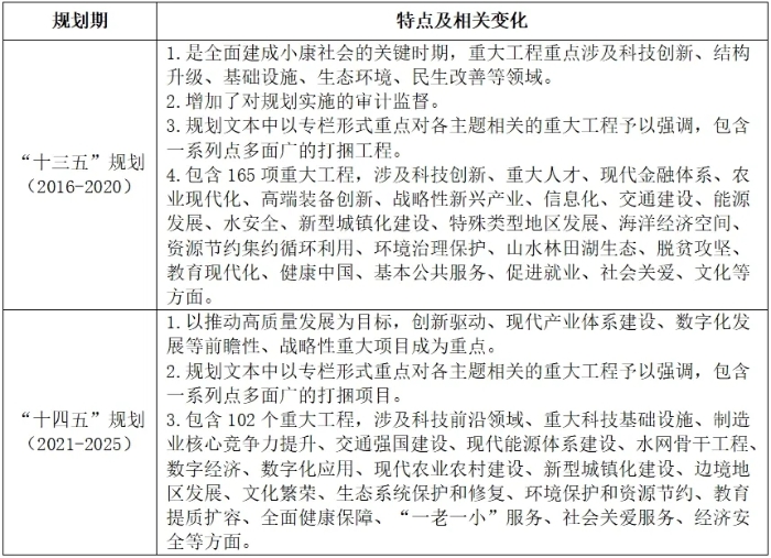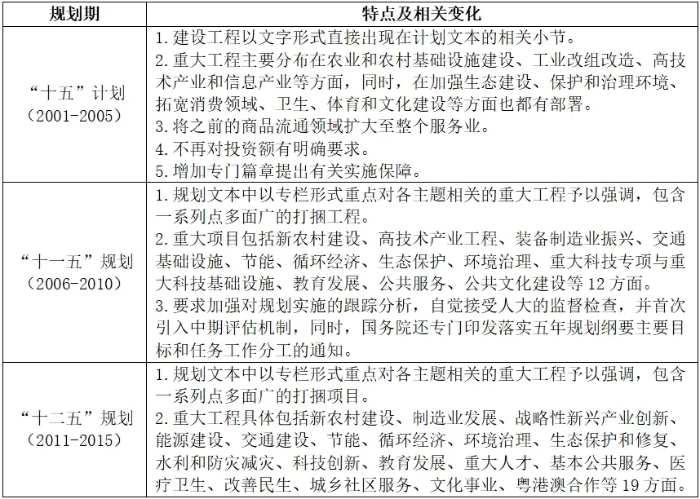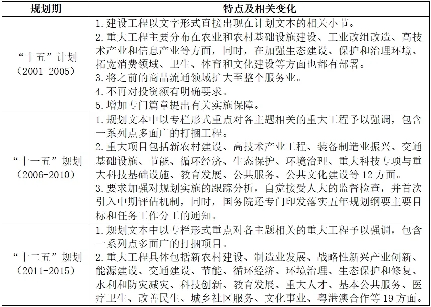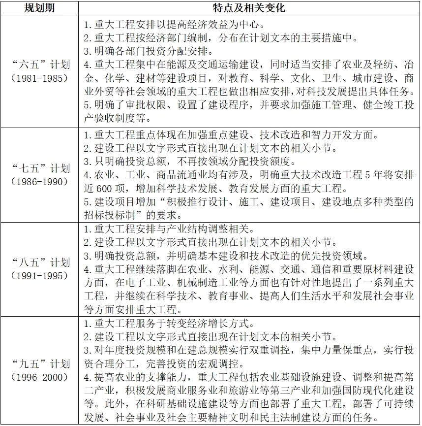 五年規劃(計劃)文本中重大工程的歷史回顧 李欣玨 曹玫 習近平總書記指出,編制和實施國民經濟和社會發展五年規劃,是我們黨治國理政的重要方式。重大工程作為五年規劃(計劃)中的核心內容,承載著實現國家戰略目標的重要使命,也是衡量和體現國家綜合實力和發展水平的重要標志。新中國成立以來,我國共編制和實施了14個五年規劃(計劃)。從“一五”計劃到“十四五”規劃,每一個五年規劃(計劃),國家都要確定百余項重大工程項目作為帶動經濟社會發展的火車頭。14個五年規劃(計劃)確定的約兩千項重大工程項目,記錄著七十余年非凡成就背后的艱辛和輝煌。以五年規劃(計劃)為引領,以重大工程項目為牽引,我國經濟社會發展取得了全方位、開創性歷史成就,發生了深層次、根本性歷史變革,為建設社會主義現代化國家奠定了堅實基礎。即將迎來的“十五五”時期是我國承上啟下的重要時期,是2035年基本實現社會主義現代化的關鍵階段,也是七大深化改革任務的完成期,更是應對復雜安全威脅的高危期,在“十五五”規劃中接續謀劃一批計長遠、促發展、利民生的重大工程項目意義重大。 作為國內規模最大的綜合性工程咨詢機構和中央政府在投資建設領域的重要咨詢單位,自1982年成立以來,中國國際工程咨詢有限公司承擔了我國幾乎所有重大工程項目的咨詢評估任務,深切感受到重大工程項目在現代化強國建設中發揮的重要作用。本文從歷史維度出發,從計劃經濟時期、計劃經濟體制向社會主義市場經濟體制轉軌時期、社會主義市場經濟體制基本建立時期、社會主義市場經濟體制完善時期等四個階段,對歷次五年規劃(計劃)文本中重大工程的特點及變化進行系統回顧。 一、計劃經濟體制時期(“一五”至“五五”) 有計劃地發展國民經濟,是新中國成立后的既定方針。為迅速恢復國民經濟并推進工業化進程,借鑒前蘇聯經驗,我國從1953年開始實施第一個五年計劃?!耙晃濉庇媱澋幕救蝿帐羌兄饕α窟M行以前蘇聯幫助中國設計的156個建設單位為中心的、由限額以上的694個建設單位組成的工業建設,建立我國社會主義工業化的初步基礎。這一時期,重大工程項目主要集中在工業領域,項目涵蓋鋼鐵、煤炭、電力、機械、化工等多個行業。在第一屆全國人民代表大會第二次會議審議通過的《關于發展國民經濟的第一個五年計劃的報告》中,各領域重大工程以文字形式體現,一般出現在措施、要求、布局、任務等小節,包括建設或改建長春第一汽車廠、鞍山鋼鐵聯合企業、沈陽第一機床廠等生產性企業,以及建設武漢長江大橋、青藏鐵路、康藏公路等大型單體項目等。此外,還在計劃中明確了各行業領域的投資額度分配和生產性單位的產能目標,計劃性特點較為突出。此后,一大批舊中國沒有的基礎工業部門開始逐步建立,第一批國產汽車出廠、第一架國產飛機試飛、第一座原子反應堆投入運轉。第一個五年計劃的實施奠定了新中國的工業化基礎。 表1 “一五”計劃中的156個重點項目 注:作者根據《第一個五年計劃(1953—1957)》等公開資料整理。 隨后,“二五”至“五五”計劃時期,國家相關部門未正式印發計劃文本。在此期間,雖受到“大躍進”“文化大革命”等政治運動的干擾和影響,國家仍集中力量推進了一批重大工程項目,如“兩彈一星”、南京長江大橋、成昆鐵路、劉家峽水電站和大慶油田等,這些項目在科技創新、基礎設施建設等方面取得了顯著成就。“一五”到“五五”,僅用5個五年計劃的時間,我國基本形成了獨立的、比較完整的工業體系和國民經濟體系,為開展社會主義建設積累了經驗。 二、計劃經濟體制向社會主義市場經濟體制轉軌時期(“六五”至“九五”) 改革開放后,我國逐步從計劃經濟體制向社會主義市場經濟體制轉軌。這一階段的五年計劃在繼續強調經濟發展的同時,開始注重社會事業的協調發展,表明在發展戰略上,從片面追求工業特別是重工業產值產量的增長,開始轉向以提高經濟效益為中心,注重農輕重協調發展,注重經濟、科技、教育、文化、社會的全面發展。計劃名稱也從“國民經濟發展五年計劃”更名為“國民經濟和社會發展五年計劃”。重大工程項目不再局限于工業領域,相應擴展到農業、交通、能源、科技、教育等多個領域。 表2 “六五”至“九五”計劃中的重大工程特點 注:作者根據《建國以來國民經濟和社會發展五年計劃重要文件匯編》等公開資料整理。 “六五”時期國家的主要任務是繼續貫徹執行1979年黨中央提出的“調整、改革、整頓、提高”八字方針。隨著全黨全國工作重心的轉移,“六五”計劃的重大工程安排也以提高經濟效益為中心。從體現形式看,重大工程按經濟部門編制,分布在計劃文本的主要措施中;從涉及領域看,主要集中在能源和交通運輸建設領域,同時適當安排了農業及輕紡、冶金、化學、建材等建設項目,對教育、科學、文化、衛生、城市建設、商業外貿等社會領域的重大工程也做出相應安排,提出科技發展具體任務;從實施管理看,要求編制統一的固定資產投資計劃,明確審批建設等制度程序。 “七五”時期國家的主要任務是進一步為經濟體制改革創造良好的經濟環境和社會環境,“七五”計劃的重大工程體現在加強重點建設、技術改造和智力開發方面。從體現形