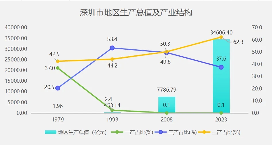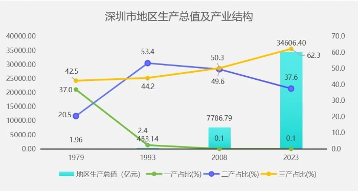 深圳經濟特區建立44周年以來,作為全國體制改革的試驗田和對外開放的重要窗口,堅持改革創新,一路快速發展,地區生產總值從1979年的1.96億元增至2023年的3.46萬億元,增長超1.5萬倍。深圳的三次產業結構進一步優化,由1979年的37.020.542.5調整為2023年的0.1:37.6:62.3。第三產業占比已經超過了第二產業,說明深圳的產業已經從勞動密集型向技術密集型轉變,從初級的加工制造向高新技術產業和現代服務業升級。