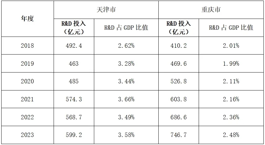統計天津市和重慶市2018-2023年R&D投入及GPD占比數據進行對比后不難發現,2018年時天津市的R&D投入超過重慶市82億元,然而從2019年后重慶市的R&D投入就反超天津市,并且差距逐年擴大。