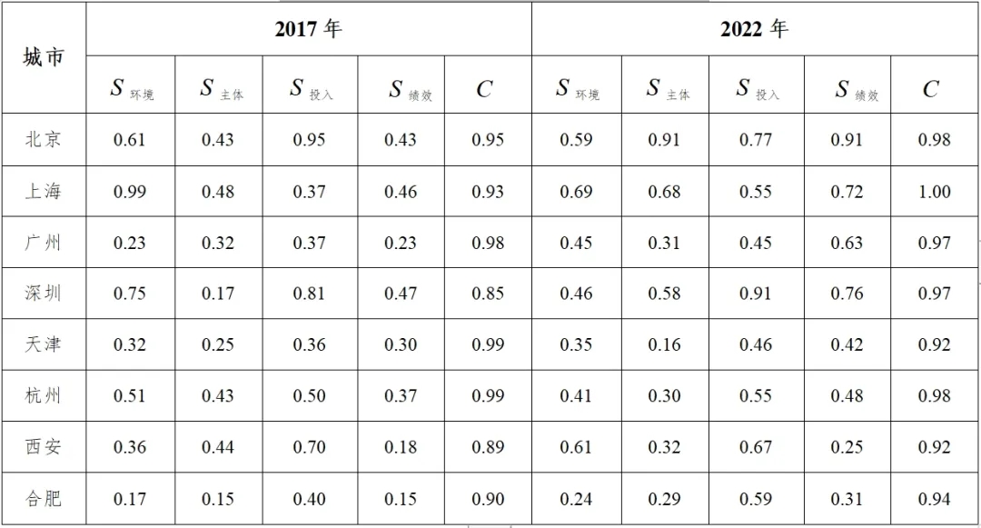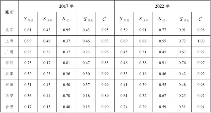 根據四系統耦合評價實證指標體系,取得合肥、深圳、杭州、天津4個研究案例城市以及鄭州、廣州、上海、北京4個類比城市2017年及2022年的相關數據;接著采用極差法對原始數據進行標準化處理,并由熵權法確定各系統、各項評價指標權重;通過綜合發展水平評價函數分別計算8個城市四系統的綜合發展水平值并分別用S環境、S主體j、S投入、S績效表示,通過耦合度模型及耦合協調度模型分別計算得各城市四系統的耦合度C值。根據S環境、S主體j、S投入、S績效、C共5個值,對樣本城市的評價可以從兩個方面展開,一個是基于S環境、S主體j、S投入、S績效值的耦合發展類型分析,另一個則是基于C值的耦合協調階段分析。