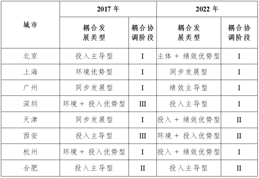 對比2017年與2022年兩個時間截面的城市類型(見表5),可以發現選取的8個城市的4個系統都處于高水平的耦合階段,且耦合程度總體呈現上升態勢,說明代表城市都在注重科創要素的協調發展。
