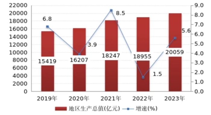 2019年,天津全市生產總值為14104.28億元。2021年全市地區生產總值15695.05億元,按可比價格計算,比上年增長6.6%。2023年全市地區生產總值16737.30億元,按不變價格計算,比上年增長4.3%,增速比上年加快3.3個百分點。