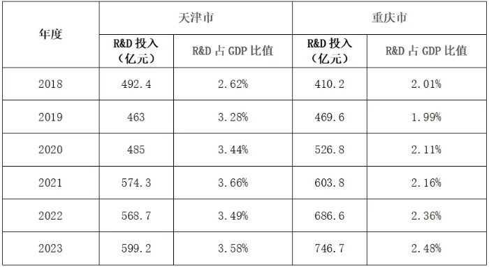表2 天津市和重慶市2018-2023年R&D投入及GPD占比對比表
