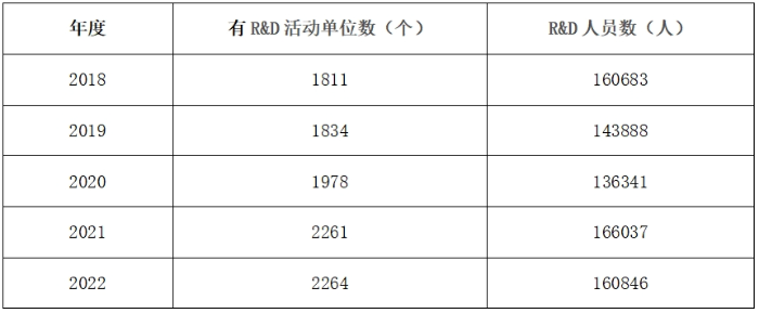 天津市R&D活動單位數量逐年增加,從2018年的1800余個逐步增加到2022年的2200余個,但增長量并不大,其中2021至2022年只增加了3個單位。而R&D人員在2018年至2020年甚至逐年遞減,2019年相對2018年的人員數降低了1萬6千余人,2020年也降低了7千余人。2020年至2021年人員增加了近3萬人,突破了2018年的人員數量,但2022年人員數量又有降低,接近了2018年的R&D人員數。從這一變化趨勢可以看出,天津市在吸引人才以及孵化科創企業方面仍然任重道遠。