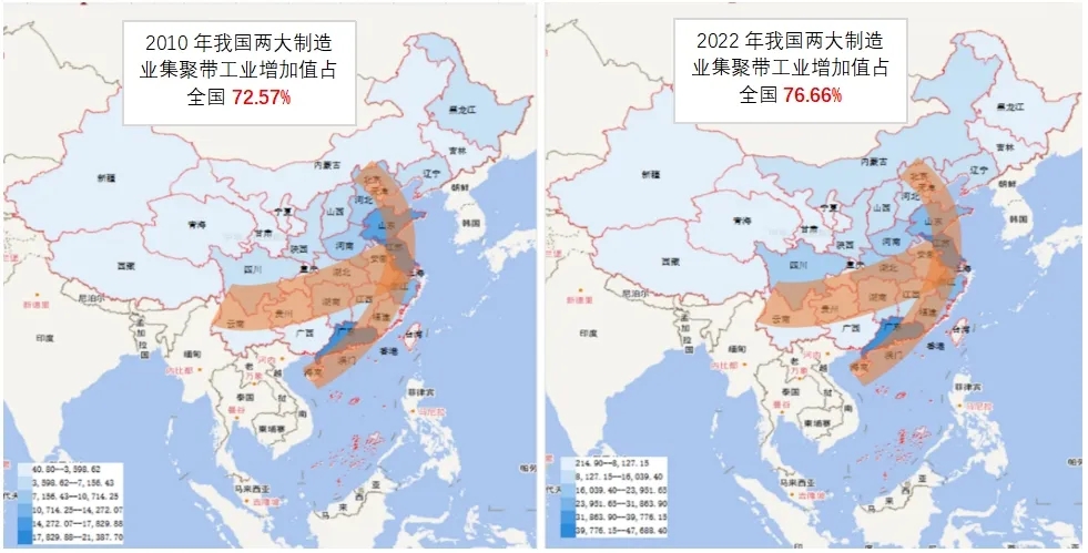 由于制造業內部協作聯系和國際聯通往來程度高,空間集聚特性突出,沿海沿江布局可以為制造業發展帶來巨大優勢。發達國家如日本的“四灣一海”地帶、德國的漢薩—魯爾—南山地帶、美國的“兩洋五湖”地帶,形成了一批制造業集聚區,成為制造強國競爭力的集中體現。我國的東部沿海地區和長江經濟帶兩大制造業集聚帶,是構建我國現代化產業體系的主體力量、參與高水平國際競爭的主要依托。2010-2022年,我國兩大制造業集聚帶工業增加值合計從140284億元增長至305747億元,占全國工業增加值的比重提高了4個百分點。其中,長江經濟帶工業增加值年均增速顯著高于全國平均增速,占比提高了6.5個百分點。