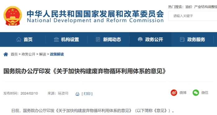 近日,國務院辦公廳印發《關于加快構建廢棄物循環利用體系的意見》(國辦發〔2024〕7號,以下簡稱《意見》)。《意見》聚焦生產生活各領域的廢棄物,分類施策,明確了推進廢棄物精細管理和有效回收、提高廢棄物資源化和再利用水平、加強重點廢棄物循環利用和培育壯大資源循環利用產業的重點任務和工作要求,指向明確、操作性強?!兑庖姟返穆涞貙嵤┍貙⑼苿淤Y源節約集約高效利用,對提升廢棄物循環利用水平和協同推進降碳、減污、擴綠、增長具有重要意義。 01、構建廢棄物循環利用體系對如期實現雙碳目標具有協同增效作用 “十四五”時期,我國生態環境保護進入減污降碳協同治理的新階段,協同推進減污降碳已成為我國新發展階段經濟社會發展全面綠色轉型的必然選擇。習近平總書記在黨的二十大報告中指出,“實施全面節約戰略,推進各類資源節約集約利用,加快構建廢棄物循環利用體系”,為新時期生態文明建設指明了方向、為加快發展循環經濟提供了根本遵循。廢棄物循環利用是循環經濟的重要組成,對減少資源消耗、提高資源利用效率、實現減污降碳協同增效至關重要。對此,以“雙碳”工作為引領,加快構建廢棄物循環利用體系,對于落實全面節約戰略、協同推進減污降碳、推進人與自然和諧共生的現代化具有十分重要的意義。 廢棄物循環利用協同降碳的作用主要表現在材料替代、流程優化、燃料替代、能效提升和產品循環等五個方面,并通過上述不同層級的利用方式實現多維度降碳。據中國循環經濟協會測算,2022年,我國通過推動廢棄物循環利用、大力發展循環經濟,共計減少二氧化碳排放約33億噸。隨著廢棄物循環利用在傳統領域不斷深化、在新興領域不斷拓寬,預計到2025年,發展循環經濟對我國碳減排的綜合貢獻率將超過30%,到2030年將超過35%??梢?,加快構建覆蓋全面、運轉高效、規范有序的廢棄物循環利用體系,是積極穩妥推進碳達峰碳中和的重要舉措,是如期實現“雙碳”目標的有效支撐。 02、《意見》堅持系統觀念,高水平構建廢棄物循環利用體系,著力優化減污降碳協同增效路徑 《意見》注重系統施策,堅持問題導向,聚焦管理、回收、資源化和再利用等重點環節,立足生產生活各領域、全環節,系統性提出構建廢棄物循環利用體系的一攬子措施,高水平構建廢棄物循環利用體系。 產生環節,實施源頭精細化管理。加強廢棄物源頭管理是高水平構建廢棄物循環利用體系的重要基礎。研究表明,通過提升工業、農業等廢棄物的全過程管理水平,可平均減少約27.6%的碳排放?!兑庖姟肪珳适┎?,圍繞我國工業源廢棄物管理制度不完善、建筑垃圾分類管理機制尚不健全等問題,有針對性地提出了規范廢棄物源頭管理的若干舉措:一是壓實廢棄物產生單位主體責任,完善一般工業固體廢棄物管理臺賬制度;二是通過分類收集、分類貯存,為工業固體廢棄物循環利用預留條件;三是分級分類整改固體廢棄物堆存場,督促貯存量大的企業加強資源循環利用;四是針對建筑垃圾回收面臨的堵點痛點,提出修訂建筑垃圾管理規定、完善建筑垃圾管理體系的新舉措,推動建立更加規范的建筑垃圾管理體系。 回收環節,注重進一步健全回收體系。廢棄物的收集與回收一頭連接著生產,一頭連接著資源化利用,是實現廢棄物循環利用協同降碳的橋梁。當前,我國農業廢棄物收集體系尚不健全、廢舊農用物資缺乏完善的處理機制、社會源廢棄物回收體系建設水平有待進一步提升。對此,《意見》提出,一是持續深化畜禽糞污收集處理利用、秸稈收儲運及廢舊農用物資回收工作;二是因地制宜健全農村廢舊物資回收網絡,積極發揮供銷合作系統回收網絡作用;三是聚焦“兩網融合”,深入推進生活垃圾分類網點與廢舊物資回收網點有效銜接,融合發展;四是深入實施生產者回收目標責任制行動,推動有條件的企業開展逆向物流回收。 利用環節,注重進一步提高利用質量。資源化和再利用是確保廢棄物再次進入物質循環,替代原生資源,實現廢棄物資源價值和降碳價值的關鍵環節,能充分發揮減少資源消耗和降碳的協同作用。目前,部分再生產品缺乏成熟的消納渠道、二手交易市場仍不規范不便利。對此,《意見》注重拓寬利用渠道,實現廢棄物資源化利用的協同降碳作用:一是拓寬大宗固廢綜合利用渠道、暢通利用消納渠道,加大復雜難用工業固體廢棄物規?;眉夹g裝備的研發力度;二是推進汽車零部件、工程機械等傳統領域再制造發展,鼓勵探索對航空發動機、工業機器人等新領域的高端裝備再制造;三是研究制定網絡舊貨交易管理辦法,出臺信息清除方法相關規范,保障信息安全,研究解決舊貨轉售、翻新等服務或相關商品涉及的知識產權問題;四是提出廚余垃圾、農林生物質等能源化利用措施,通過燃料替代減少化石能源消費帶來的碳排放;五是加強余壓余熱的資源化利用,提高能源利用效率,減少對化石能源的消耗。 此外,《意見》還針對新興領域廢棄物循環利用進行了再部署、再推動。在雙碳背景下,新能源產業迎來新的發展機遇,產業規模迅速擴大,與新能源產業蓬勃發展同步的是退役動力電池、光伏組件、風機葉片等新興領域廢棄物的大量產生。實現退役設備循環利用,對促進全產業鏈協同降碳有重要意義?!兑庖姟丰槍@一領域精準發力,提出了切實有