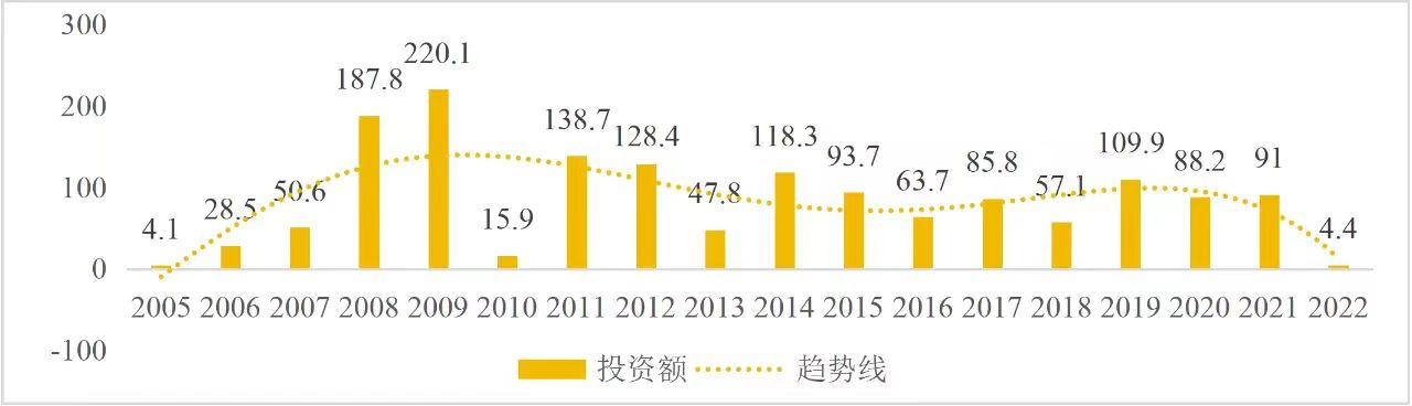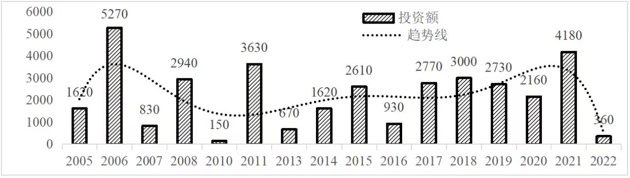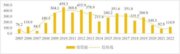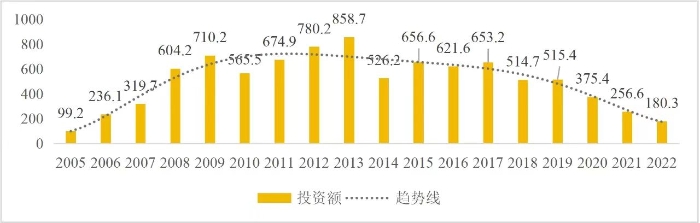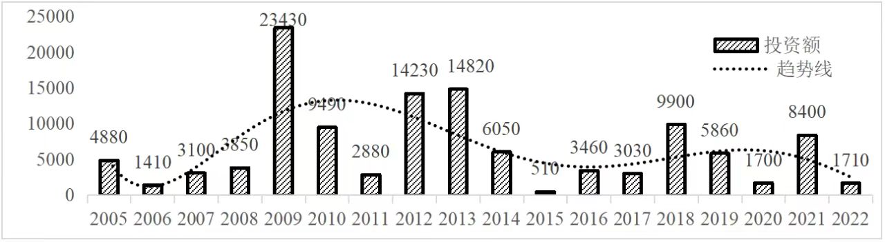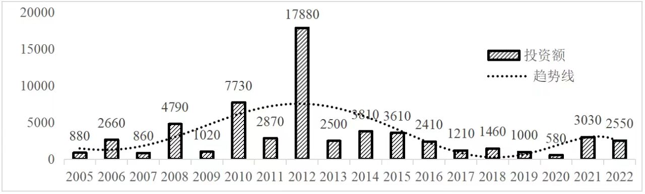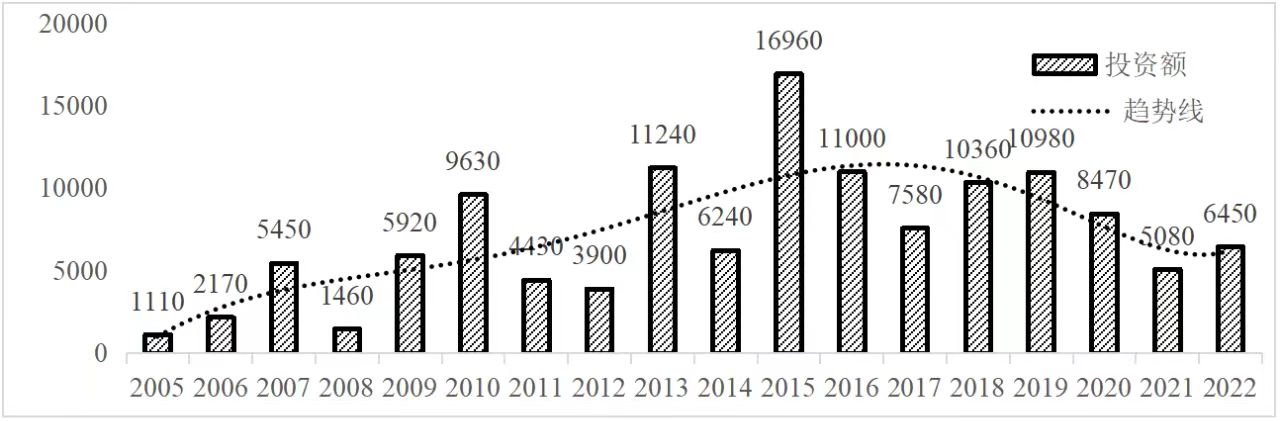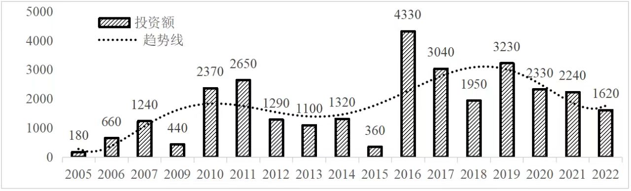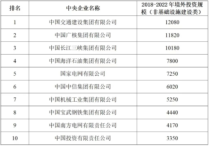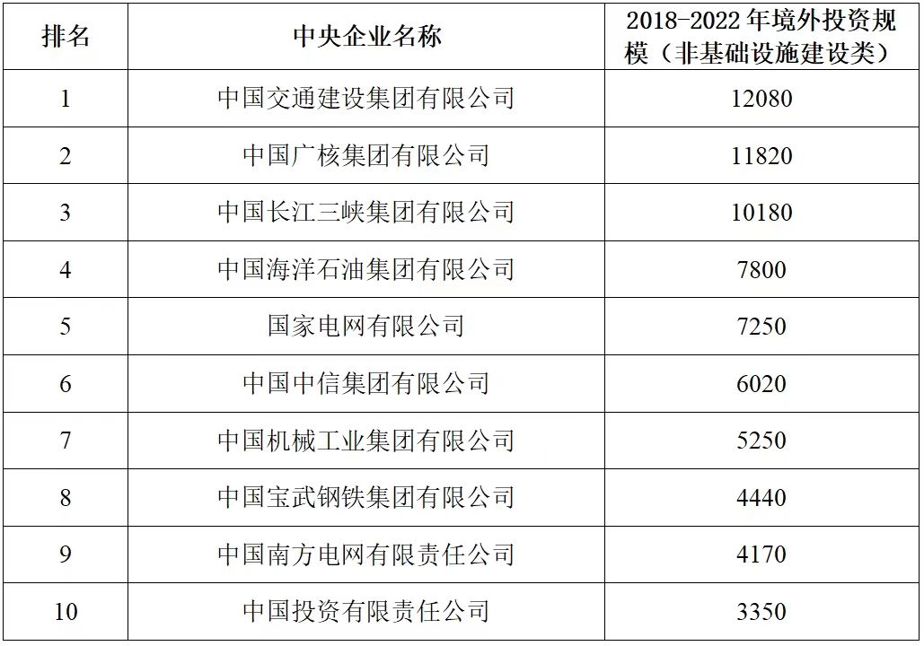 企業境外投資研究之二: 中央企業境外投資情況 楊凱越 編者按:根據商務部2023年10月發布的我國對外直接投資統計數據,截至2022年,我國對外直接投資存量達27548.1億美元,當年對外直接投資規模達1631.2億美元,居世界第二位。截至2022年底,中國2.9萬家境內投資者共設立境外企業4.66萬家,分布在全球190個國家(地區),年末境外企業資產總額8.4萬億美元。隨著“雙循環”戰略、“走出去”戰略和“一帶一路”倡議的深入推進實施,對企業境外投資開展系統研究,探索如何更高質量地開展境外投資,成為當前一項重要和緊迫的任務。本公眾號將企業境外投資研究成果以系列文章的形式陸續刊發,本文是研究報告的第二部分,供業界同仁參考。 一、總體情況 中央企業2013-2019年境外投資年均增速約15%,營業收入增速保持在約4.5%。根據國務院國資委和社科院聯合發布的《中央企業海外社會責任藍皮書(2020)》,中央企業在境外投資發展時,7%投資第一產業,69%參與第二產業,40%發展第三產業。截至2019年底,中央企業境外資產總額8.1萬億元、所有者權益2.3萬億元。其中,81家中央企業在“一帶一路”沿線承擔項目數量逾3400個。中央企業承擔“一帶一路”基礎設施項目數比率超過60%,合同投資額超過80%。 近年來,中央企業境外投資及運營總體仍呈現較為平穩的態勢。中央企業2013-2020年境外營業收入總規模逾24萬億元,利潤總規模約6000億元。2021年,中央企業和單位對外非金融類直接投資642.9億美元,占我國對外直接投資比重約36.0%,同比增長30.7%,逾60%來自收益再投資。根據國務院國資委《中央企業海外發展報告(2023)》,截至2022年底,中央企業境外投資機構和項目逾8000個,境外員工125萬人,境外資產總額近8萬億元(比2019年略有下降),當年境外投資規模3739億元。 表1 中央企業境外投資規模 單位:億美元 數據來源:商務部2016-2021年度中國對外直接投資統計公報。 本文根據中國全球投資追蹤(China Global Investment Tracker,CGIT)數據庫,按照國務院國資委2023年中央企業名錄,對我國中央企業境外投資情況進行了整理。因數據口徑不同,中央企業境外投資規模與前述商務部統計數據有所差異。根據CGIT數據,中央企業境外投資在2013年達到峰值858.7億美元,此后呈下降趨勢,2022年境外投資規模僅180.3億美元。 數據來源:CGIT數據庫,作者整理。 圖1 2005-2022年中央企業境外投資規模 單位:億美元 根據CGIT數據庫,中央企業2005-2022年各行業境外投資情況見圖2。其中,能源類境外投資規模最高,為4460.1億美元;建筑工程類(包括鐵路、公路等交通基礎設施建設類)境外投資規模其次,為1534億美元;金屬類(含礦產)境外投資排名第三為972.5億美元;公用事業類境外投資規模第四,為702.5億美元;此外,中央企業境外投資涉及領域還包括旅游、健康、金融、科技、農業、化工、物流、娛樂等。2018-2022年各行業境外投資情況見圖3。 數據來源:CGIT數據庫,作者整理。 圖2 2005-2022年中央企業分行業境外投資規模 單位:億美元 數據來源:CGIT數據庫,作者整理。 圖3 2018-2022年中央企業分行業境外投資規模 單位:百萬美元 二、分行業情況 本文對2005年1月-2022年12月我國中央企業境外投資選取能源行業、建筑工程行業、金屬行業、公用事業、旅游業等投資規模位居前列的行業,分行業情況進行了整理。 (一)能源行業 2005-2022年中央企業能源行業境外投資情況見圖4。分析發現,我國中央企業能源行業境外投資在2010年達到峰值后呈逐年下降的趨勢。 數據來源:CGIT數據庫,作者整理。 圖4 能源行業2005-2022年中央企業境外投資規模 單位:億美元 (二)建筑工程行業 2005-2022年中央企業建筑工程行業境外投資情況見圖5。分析發現,建筑工程行業境外投資在2009年達到峰值,此后呈逐年下降。 數據來源:CGIT數據庫,作者整理。 圖5 建筑工程行業2005-2022年中央企業境外投資規模 單位:億美元 (三)金屬行業 2005-2022年中央企業金屬行業境外投資情況見圖6。分析發現,金屬行業2007年達到投資峰值,此后逐年下降。 數據來源:CGIT數據庫,作者整理。 圖6 金屬業2005-2022年中央企業境外投資規模 單位:億美元 (四)公用事業 2005-2022年中央企業公用事業境外投資情況見圖7。分析發現,公用事業2013年達峰后,整體呈下降趨勢。 數據來源:CGIT數據庫,作者整理。 圖7 公共事業2005-2022年中央企業境外投資規模 單位:億美元 (五)旅游業 2005-2022年中央企業旅游業境外投資情況見圖8。分析發現,旅游業在2014-2019年間整體呈現較為平穩的對外投資規模,2019年后暫無相關對外投資。 數據來源:CGIT數據庫,作者整理。 圖8 旅游業2005-2022年中央企業境外投資規模 單位:億美元 三、企業個體情況 (一)概述 本文對2018年1月-2022年12月我國中央企業境外投資的非基礎設施類和基礎設施類投資分別進行了統計,表2和表3分別列出了非基建和基建類境外投資規模居于前10的企業。近5年來,我國中央企業非基礎設施建設類境外投資規模排名前5的企業分別為中國交通建設集團有限公司(以下簡稱中交集團)、中國廣核集團有限公司(以下簡稱中廣核集團)、中國長江三峽集團有限公司(以下簡稱三峽集團)、中國海洋石油集團有限公司(以下簡稱中國海油)和國家電網有限公司(以下簡稱國家電網),投資額分別為120.8億美元、118.2億美元、101.8億美元、78億美元和72.5億美元。 表2 近幾年中央企業境外投資(非基礎設