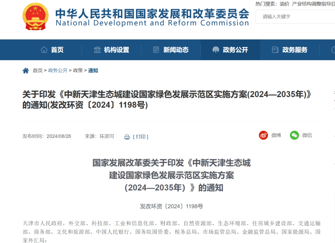 發揮中新合作平臺優勢 高標準高質量建設國家綠色發展示范區 ——《中新天津生態城建設國家綠色發展示范區實施方案(2024—2035年)》解讀 朱黎陽 范瑩瑩 近日,經國務院批復同意,國家發展改革委印發《中新天津生態城建設國家綠色發展示范區實施方案(2024—2035年)》(發改環資〔2024〕1198號,以下簡稱《方案》),立足新形勢新要求,從多個維度對下一階段中新天津生態城(以下簡稱生態城)建設國家綠色發展示范區升級版的目標任務作出了全面系統部署。 01、《方案》是新征程上生態城綠色發展的施工圖 2013年,生態城成為首個國家綠色發展示范區。2013年5月,習近平總書記在生態城視察時強調,“生態城要兼顧好先進性、高端化和能復制、可推廣兩個方面,在體現人與人、人與經濟活動、人與環境和諧共存等方面作出有說服力的回答,為建設資源節約型、環境友好型社會提供示范”。十多年以來,生態城認真貫徹落實習近平總書記對天津及生態城的重要指示精神,全力推動國家綠色發展示范區建設取得豐碩成果,從鹽堿荒灘蛻變成生態之城、智慧之城、幸福之城,成為生態文明建設的示范區、綠色發展體制機制的創新區和綠色思想文化的策源地。 在新征程的新起點上,《方案》提出了生態城新十年建設國家綠色發展示范區“3+20”的任務目標體系。確立了綠色發展的三項示范任務,一是要在綠色低碳產業效益上發揮先導帶動作用,形成具有國際競爭優勢的綠色低碳產業集群,單位地區生產總值二氧化碳排放水平保持領先;二是在綠色低碳創新能力上發揮先行引領作用,培育一批綠色低碳技術創新載體和平臺,取得一批綠色低碳技術知識產權,形成綠色低碳高質量發展技術和標準支撐體系;三是在綠色低碳開放合作上發揮重要牽引作用,打造產業合作、技術轉移、人才培養平臺,建設綠色低碳領域國際合作重要樞紐。同時,《方案》還結合生態城發展實際,提出了20項具體指標,部分指標達到國際領先水平,比如,單位GDP二氧化碳排放量,我國的平均水平約1噸二氧化碳/萬元,發達國家水平約為0.2噸二氧化碳/萬元,生態城目前是0.27噸二氧化碳/萬元,2035年目標值是0.2噸二氧化碳/萬元以下。此外,還有一些指標也具有較強的先進性,比如,到2035年,研發經費投入強度翻倍,綠電占全社會用電量比重達到近100%。這些任務和指標不僅體現了國家對生態城未來發展的高要求,也彰顯了生態城在綠色發展領域的國際視野和雄心壯志。 當前,我國已經開啟全面建設社會主義現代化國家新征程,我們要建設的現代化是人與自然和諧共生的現代化,要加快經濟社會發展全面綠色轉型。8月11日,中共中央、國務院印發《關于加快經濟社會發展全面綠色轉型的意見》,提出將綠色轉型的要求融入經濟社會發展全局,全方位、全領域、全地域推進綠色轉型,形成節約資源和保護環境的空間格局、產業結構、生產方式、生活方式。《方案》立足新形勢新要求,深入貫徹黨的二十大和二十屆二中、三中全會精神,認真貫徹習近平生態文明思想,重新布局生態城綠色發展的目標任務,提出打造以綠色低碳高質量發展為主線、以高附加值細分產業為重點、以國際一流營商環境為特征的國家綠色發展示范區,推動綠色發展理念融入生態城經濟社會發展各領域全過程,為加快經濟社會發展全面綠色轉型探索新路徑。 02、《方案》充分發揮中新合作平臺優勢,建設綠色低碳開放合作的新高地 黨的二十屆三中全會提出,開放是中國式現代化的鮮明標識。必須堅持對外開放基本國策,堅持以開放促改革,依托我國超大規模市場優勢,在擴大國際合作中提升開放能力,建設更高水平開放型經濟新體制。生態城作為中國和新加坡兩國政府間重大合作項目,是世界上首個國家間合作開發的生態城市。過去十多年,中新雙方圍繞高水平合作,探索建立了一整套全新的區域合作開發模式,形成了獨具特色的合作交流渠道,最大程度發揮了雙方政策、資金、資源等綜合優勢。在京津冀協同發展戰略中,生態城、雄安新區、北京通州以三角之勢起到支撐引領作用。在建設國家綠色發展示范區的過程中,生態城要充分發揮在綠色低碳開放合作上的重要牽引作用。 面向2035年,《方案》全面落實黨的二十屆三中全會精神,充分發揮中新合作平臺優勢,繼續深化中新兩國在綠色技術、綠色裝備、綠色服務、綠色基礎設施、綠色金融等方面的交流合作,導入新加坡優質綠色產業資源,持續拓展中新合作深度和廣度,將生態城打造成中國面向共建“一帶一路”國家開展綠色低碳技術成果交流、產業合作和經貿往來的重要窗口。一是借助新加坡國際航運樞紐、貿易中心和金融中心資源優勢,依托天津港智慧近零碳碼頭,吸引新加坡航運、海事等企業落地。二是充分發揮高校、科研院所、龍頭企業創新帶動作用,加強與新加坡政府部門、科研院所、協會組織合作,積極引進綠色技術研究院、綠色創新實驗室和知名投資機構等優質創新資源。三是借鑒新加坡政府部門服務企業的理念,完善相關體制機制,優化營商環境,及時解決企業在生產經營、技術研發、市場開拓中遇到的各類問題,快速導入國際國內先進綠色低碳技術和龍頭企業。這不僅有助于生態城自身的發展,也為我國面向共建“一帶一路”國家開展綠色低碳技術成果交流、產業合作和經貿