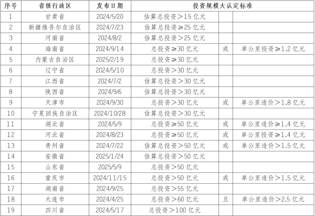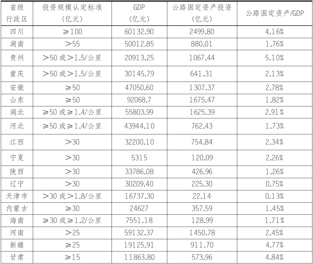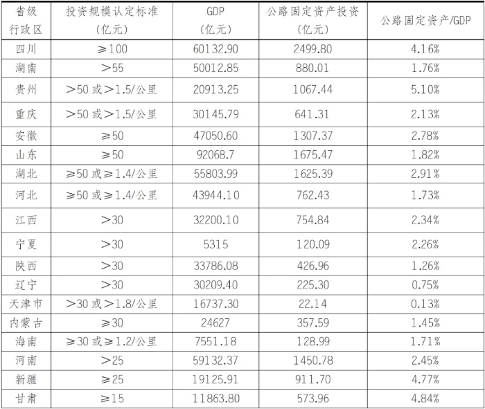 編者按:2023年11月,《關于規范實施政府和社會資本合作新機制的指導意見》(國辦函〔2023〕115號)發布,投資規模大、建設難度高的收費公路等項目被列為“積極創造條件、支持民營企業參與”的項目,不強制要求民營企業在PPP項目公司具體持股比例。除此類項目外,其他收費公路項目需滿足“民營企業股權占比原則上不低于35%”。PPP新機制發布近兩年來,各地陸續出臺對“投資規模大、建設難度高”收費公路項目量化認定標準。本研究系統梳理截至2025年9月底全國各地已正式發布的全部官方標準,基于投資規模與建設難度兩個維度開展比較分析。各地出臺的認定標準是PPP新機制下地方政府精細化、差異化治理的具體實踐,為市場主體提供了投資指引,同時成為觀察區域基建重點與政策導向的重要窗口。本文是PPP新機制觀察系列研究:收費公路“投資規模大、建設難度高”認定標準的第一部分,闡述認定標準發布整體情況,分析“投資規模大”的具體界定標準,供業界同仁參考。 “PPP新機制觀察”系列研究 收費公路“投資規模大”認定標準 郭艷鑫 張雪飛 伍迪 摘要:本研究系統梳理截至2025年9月底全國各地已正式發布的“投資規模大、建設難度高”收費公路項目認定標準,研究發現,在“投資規模大”方面,投資規模閾值分布于15億元至100億元之間,其設定與地方GDP、公路固定資產投資等經濟指標呈現正相關,反映地方經濟實力與基建需求的深層影響,本文為理解地方PPP治理邏輯、區域差異及政策協同提供了實踐依據。 關鍵詞:PPP;特許經營;新機制;收費公路;投資規模大;建設難度高;認定標準;區域差異 2023年11月,國務院辦公廳轉發國家發展改革委、財政部《關于規范實施政府和社會資本合作新機制的指導意見》(國辦函〔2023〕115號,以下簡稱《指導意見》),標志著我國政府和社會資本合作(PPP)事業邁入全新發展階段。PPP新機制明確三大核心導向,即社會資本優先選擇民營企業、回報機制聚焦使用者付費、實施模式全部采用特許經營。其中,最大程度鼓勵民營企業參與,既是貫徹落實黨中央、國務院決策部署的關鍵舉措,也是引導市場回歸PPP初衷本源、進一步調動民間投資積極性的重要抓手。 《指導意見》明確,“最大程度鼓勵民營企業參與政府和社會資本合作新建(含改擴建)項目”,這一要求既契合我國引入PPP模式的初衷,也順應了當前激發民間資本投資活力的客觀需求。同時,考慮到國有企業是我國市場主體的重要組成部分,《指導意見》并未對國有企業參與PPP項目采取“一刀切”式禁止,而是制定了《支持民營企業參與的特許經營新建(含改擴建)項目清單(2023年版)》(以下簡稱《清單》)。該《清單》依據市場化程度、公共屬性強弱、是否具備自然壟斷性等特征,對新建(含改擴建)項目進行分類設置民營企業參與要求,將“屬于市場的還給市場”,充分體現新機制在兼顧PPP項目公益性的同時、最大化釋放市場效率的政策導向。具體而言,市場化程度較高、公共屬性較弱的項目,應由民營企業獨資或控股;關系國計民生、公共屬性較強的項目,民營企業股權占比原則上不低于35%;少數涉及國家安全、公共屬性強且具備自然壟斷屬性的項目,需積極創造條件支持民營企業參與。 值得關注的是,《清單》對收費公路項目的分類較為特殊:不符合“投資規模大、建設難度高”情形的收費公路項目,歸為“關系國計民生、公共屬性較強”的第二類項目,民營企業股權占比原則上不低于35%;“投資規模大、建設難度高”的收費公路等項目,則歸為第三類項目,需通過積極創造條件支持民營企業參與,但未強制要求民營企業參股比例。 為明確“投資規模大、建設難度高”的認定邊界,部分地區陸續公開發布收費公路項目量化認定細則。截至2025年9月底,全國已有19個省級行政區和計劃單列市出臺了收費公路“投資規模大、建設難度高”認定標準(以下簡稱認定標準),不同區域的認定標準既存在差異也具備共性。本文聚焦各地出臺的相關認定標準開展研究,并重點關注“投資規模大”維度的指標,形成若干思考,旨在為業界提供參考借鑒。 一、認定標準發布總體情況 截至2025年9月底,全國已有18個省級行政區發布收費公路“投資規模大、建設難度高”認定標準。其發布時間范圍為2024年5月至2025年5月,已發布認定標準的各省級行政區域具體如圖1所示,較深的顏色代表出臺的時間較早。另有1個計劃單列市(大連市)在2024年4月發布認定標準。從時間特征來看,發布呈兩大高峰,2024年5月(湖北省、遼寧省、四川省、甘肅省)和9月(陜西省、海南省、湖南省、天津市)集中出臺。從分布區域來看,西北地區(4個)、中南地區(4個)發布相對較多,華東地區(3個)、華北地區(3個)、西南地區(3個)次之。從政策有效期來看,10個地區明確2年有效期,其中新疆維吾爾自治區、重慶市提出期滿后“視情況延續”,各地已發布認定標準基本信息具體如表1所示。 圖1 已發布認定標準的省級行政區域 表1 各地已發布認定標準基本信息 注:(1)山西省于2025年7月25日發布公開征求《山西省特許經營收費公路項目“投資規模大、建設難度高”認定標準(征求意見稿)》意見的通知,但截至9月底未見正式公開發布,因此未列入表中。(2)黑龍江省于2025年9月8日發布公開征求《黑龍江省“投資規模大、建設難度高”收費公路