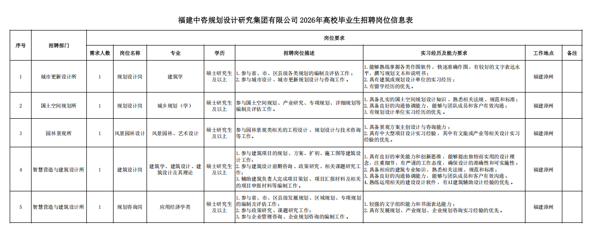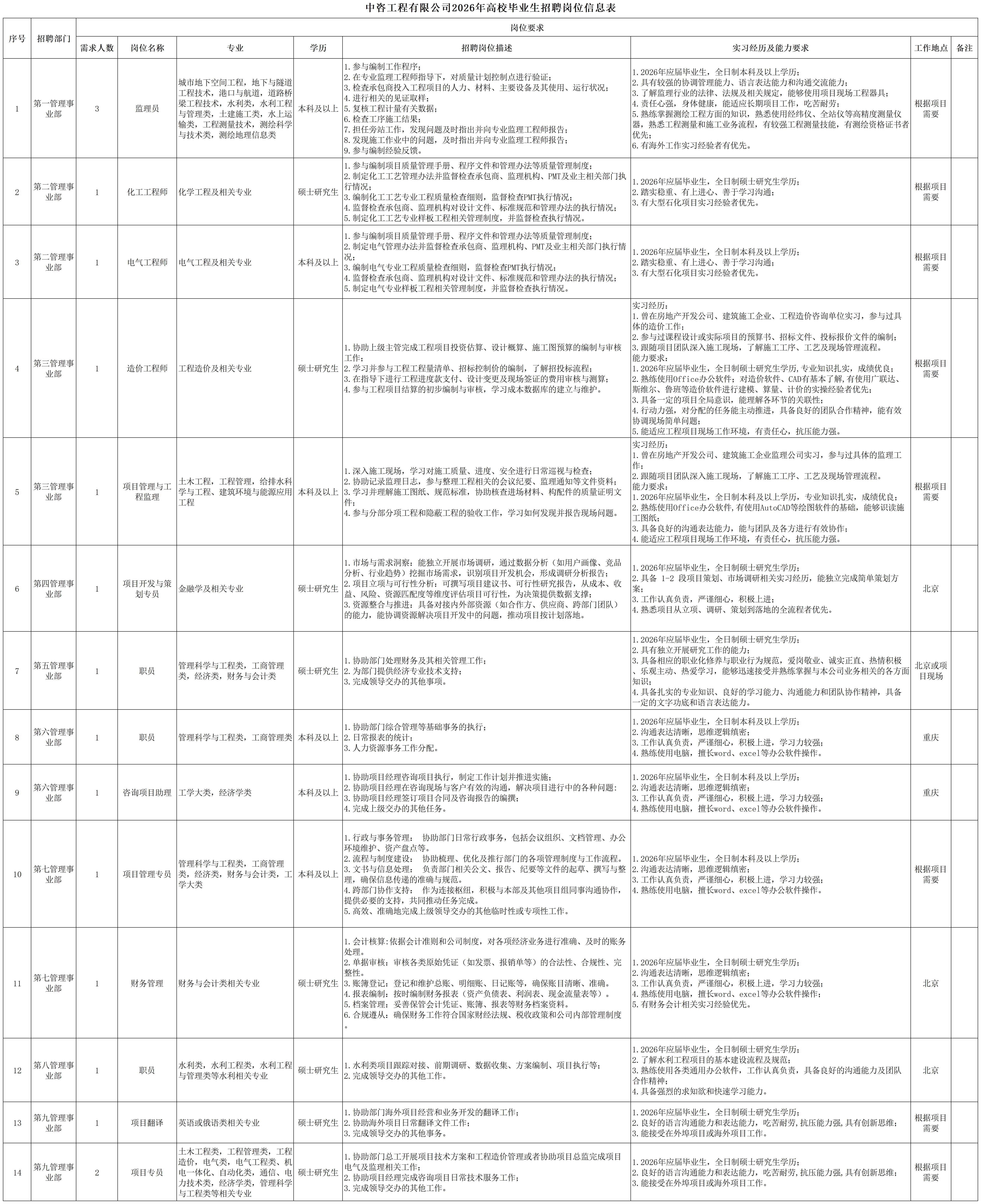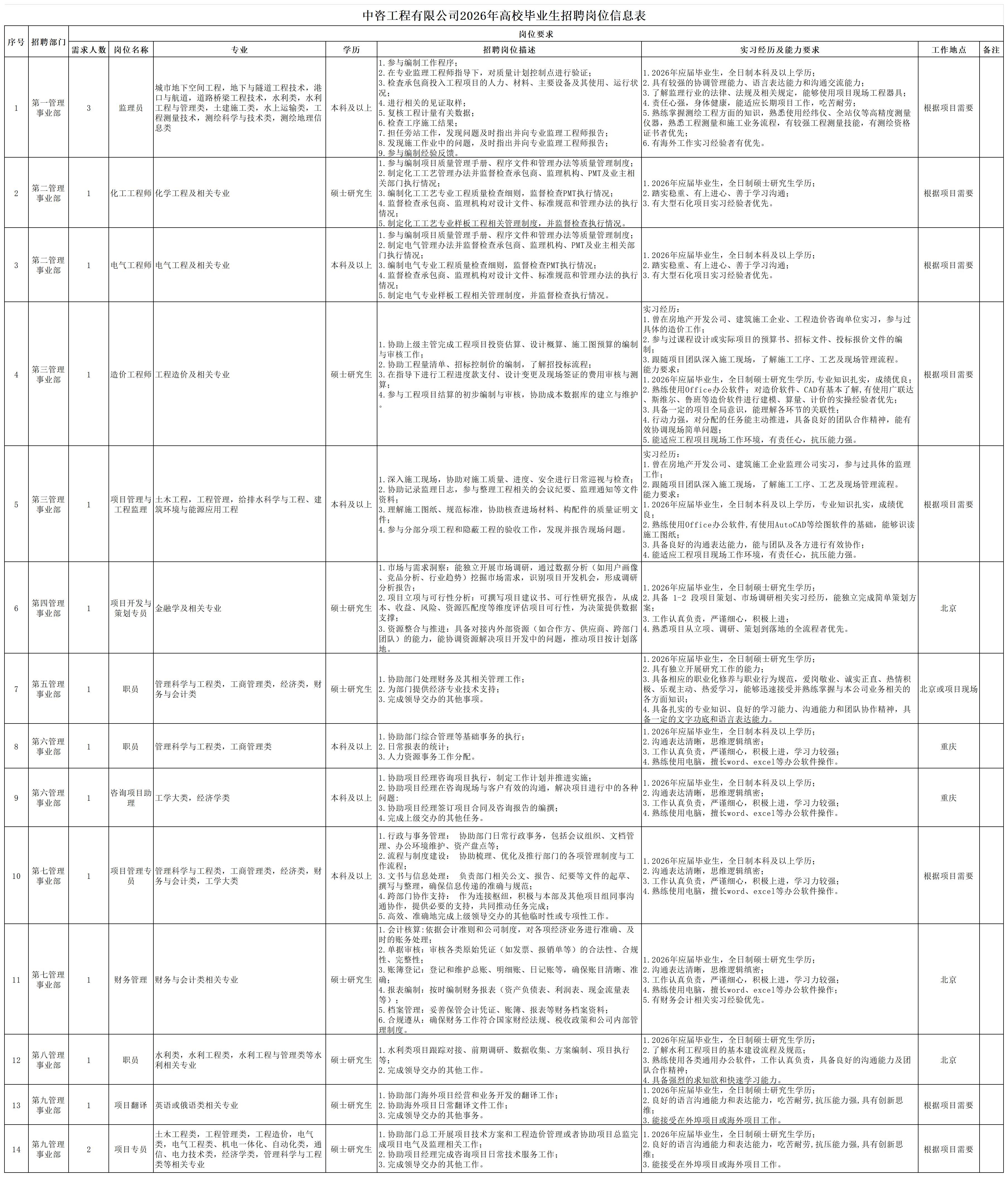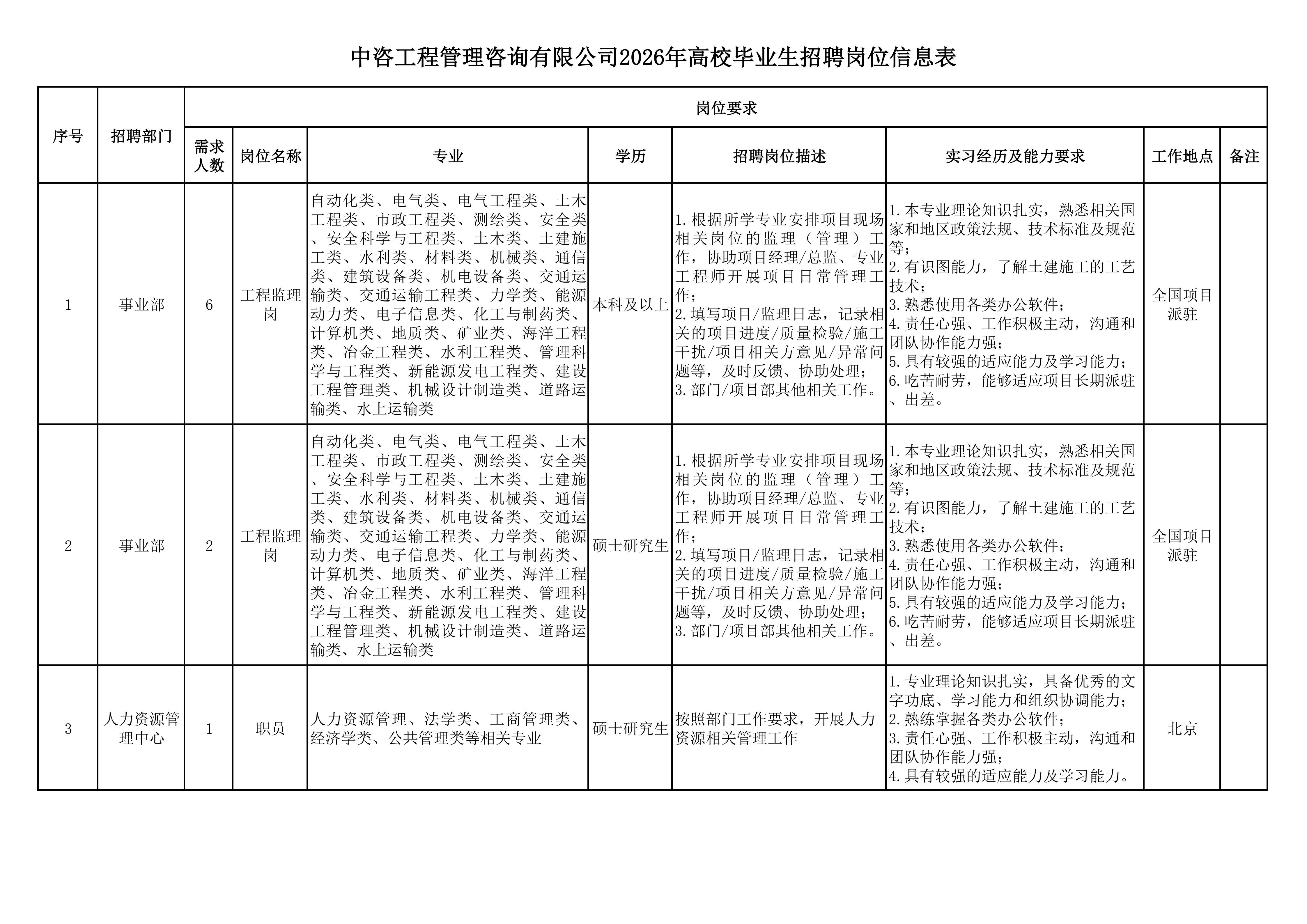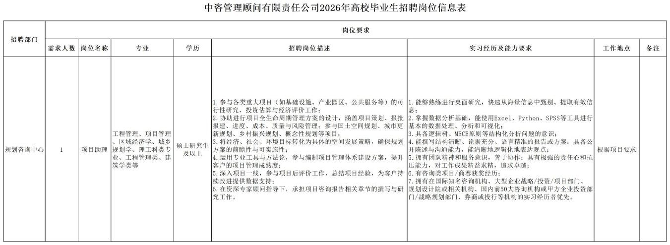 一、公司簡介 中咨工程管理咨詢有限公司(簡稱中咨管理)成立于1989年,是中國國際工程咨詢有限公司的核心骨干子公司,注冊資金1.55億元。現有各項資質證書持證2800余冊,中高級職稱比例超50%。 中咨管理公司是國內從事工程管理類業務最早、規模最大、行業最廣、業績最多的企業之一,具有工程咨詢甲級資信、工程監理綜合資質以及設備、公路工程、地質災害防治工程、人民防空工程等多項專業監理甲級資質,并列入政府采購招標代理機構和中央投資項目招標代理機構名單。業務涵蓋工程前期咨詢、項目管理、項目代建、招標代理、造價咨詢、工程監理、設備監理、設計優化、工程質量安全評估咨詢等項目全過程咨詢服務,涉及房屋建筑、交通、石化、水利、電力、冶煉、礦山、市政、生態環境、通信和信息化等多個行業。業務遍布全國及全球近50個國家和地區,累計服務各類咨詢管理項目超過1萬個,涉及工程建設投資近5萬億元。曾榮獲56項中國建設工程魯班獎、15項中國土木工程詹天佑獎、64項國家優質工程獎、23項中國鋼結構金獎以及各類省級或行業獎項500余項。 經過30余年的不懈努力,我們積累了豐富的工程管理經驗,為各類工程建設項目保駕護航,“中咨管理”品牌成為行業的一面旗幟。我們崇尚簡單、包容、共享的理念,秉持創造價值、貢獻社會的使命和專業創造精品、價值成就客戶的核心價值觀,為成為全過程工程管理咨詢的領先者而奮斗。優秀的你值得更好的平臺,加入我們,攜手共創新篇章! 二、應聘條件 (一)2026年全日制本科及以上應屆畢業生。 (二)年齡要求:本科生26周歲及以下(2000年1月1日后出生),碩士研究生30周歲及以下(1996年1月1日后出生)。 (三)在校就讀期間無在職工作經歷,無社保繳納記錄和派遣落戶記錄。 (四)成績優秀,人品端正,積極進取,愿與公司共改革、奮進。 (五)具備扎實的專業理論知識和良好的溝通能力,實踐能力較強。 (六)熟練使用各類辦公軟件。 (七)簡歷需注明出生日期、生源地(即入學前戶籍所在地)。 三、應聘程序 發布招聘公告→簡歷投遞→簡歷篩選→筆試→面試→確定人選并公示→發放錄用通知。 四、崗位信息 五、報名方式 本次招聘報名采取在線填報方式進行:應聘者請使用Chrome內核瀏覽器(如:Chrome瀏覽器、360瀏覽器、百度瀏覽器、搜狗瀏覽器、UC瀏覽器等)登錄網站報名,網站鏈接:https://hcmcloud.ciecc.com.cn/recruit/#/index 或使用手機掃描二維碼: 中咨工程有限公司 一、 公司簡介 中咨工程有限公司成立于2010年,是中國國際工程咨詢有限公司(簡稱中咨公司)的控股子公司,由中咨公司和中國廣核電力股份有限公司合資成立。 公司作為中咨公司工程管理業務板塊的核心成員,主營業務為全過程工程管理(咨詢)服務業務,包括全過程中的各節點業務(1+X),業務范圍涉及石化、核電、冶金、交通和民用市政等多個領域行業工程項目的前期咨詢及咨詢管理、勘察管理、設計管理、監理、采購管理、造價咨詢、建造過程管理、項目管理(IPMT、PMC等)、項目代建和技術服務等。 公司以為國家、社會和股東創造價值為己任,以兩大股東提供的廣闊市場機遇和成熟先進的管理體系為發展驅動力,通過積極參與市場競爭,努力培育公司核心競爭能力,打造一支特別能戰斗的具有復合型人才的專業化隊伍,矢志發展成為具備承接大中型全過程工程管理(咨詢)服務業務能力的、具有國際競爭力的工程公司。 二、 應聘條件 (一)2026年全日制本科及以上應屆畢業生(部分崗位碩士研究生學歷),在校就讀期間無在職工作經歷,無社保繳納記錄和派遣落戶記錄,學習成績優良。 (二)良好的語言表達能力和溝通能力,執行力強,學習能力強,協作能力強。 (三)身體健康,具有良好的職業道德修養,具有較強的責任心。 (四)熟練使用常用辦公軟件,具有一定的文字功底。 (五)無違規違法記錄,無不良嗜好,身體素質好,能吃苦耐勞,能承受較大的工作壓力。 三、 招聘程序 發布招聘公告→簡歷篩選→資格審查→綜合能力測評→面試→確定人選并公示→發放錄用通知→入職。 四、 崗位信息 五、 報名方式 本次招聘報名采取在線填報方式進行:應聘者請使用Chrome內核瀏覽器(如:Chrome瀏覽器、360瀏覽器、百度瀏覽器、搜狗瀏覽器、UC瀏覽器等)登錄網站報名,網站鏈接:https://hcmcloud.ciecc.com.cn/recruit/#/index 或使用手機掃描二維碼: 中咨海外咨詢有限公司 一、公司簡介 中咨海外咨詢有限公司是中國國際工程咨詢有限公司所屬二級子公司,于1988年成立,經過30多年發展,為各級政府、企事業單位提供了萬余項咨詢服務,在國內咨詢領域具有一定知名度和較高信譽,具備較好的發展基礎。2021年入選國資委“管理標桿”企業,2022-2025年連續4年蟬聯國資委“雙百行動標桿”企業。 公司主要從事戰略謀劃、投資策劃、全過程咨詢以及規劃設計和建設投資管理經營五大業務。善于謀劃策劃創造發展新優勢,努力成為工程建設領域原創思想策源地;善于科學設計項目功能成本方案,致力成為國內優化設計領域先行者;善于系統提供區域發展整體解決方案,努力成為國內有影響力的具有研究特質的咨詢設計企業。公司為國家高新技術企業,擁有工程咨詢行業綜合甲級資信、15項專業專項甲級資信;公路、建筑、市政行業7項專業甲級設計資質;市政行業2項專業乙級設計資
