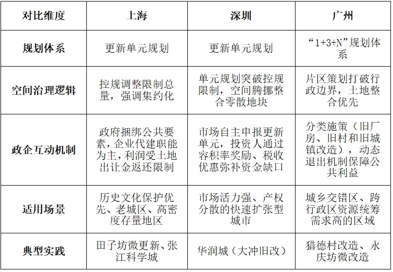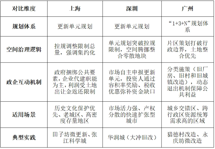 我國城市更新制度體系與經驗分析 ——以上海、深圳、廣州為例 石延杰 摘要:隨著我國城鎮化進程進入存量更新階段,城市更新成為破解空間資源約束、推動高質量發展的重要路徑。本文以國家政策框架為背景,選取上海、深圳、廣州為典型案例,系統梳理三地城市在制度體系、實施路徑與創新實踐上的更新經驗。研究發現,上海側重政府統籌下的剛性規劃與公共利益保障,深圳依托市場化政策工具,探索高強度開發與公共利益兼容機制,廣州則通過分類施策與多元主體利益協調機制破解復雜更新難題。研究建議,未來城市更新需立足城市稟賦優化制度供給,通過健全法律體系、創新多元融資機制、深化公眾參與,實現空間治理現代化與經濟、社會、文化價值的協同提升。 關鍵詞:城市更新;政策體系;經驗分析 近年來,隨著我國城鎮化水平的提高,大量城市在經歷快速擴張后逐漸面臨空間資源緊張、基礎設施老化、生態環境惡化、文化遺產保護壓力增大等問題。在“增量建設”空間日趨飽和的背景下,如何通過城市更新對既有建成區進行功能重塑、空間優化與人居環境提升,成為城市高質量發展的重要議題[1]。城市更新由此成為我國城市轉型升級過程中的關鍵抓手,既要滿足城市經濟再增長的需求,也要兼顧文化和環境的多重價值。 一、現階段我國城市更新政策體系及特點 為引導各地因地制宜地實施城市更新,國家相關部門先后出臺了多項指導性文件,對城市更新的總體原則、實施路徑、管理機制等做出了明確規定。 (一)政策體系 從國家層面政策演進脈絡來看,當前城市更新制度體系主要圍繞戰略定位、制度約束、規劃統籌與保障機制四個維度展開系統性建構。戰略導向層以《中華人民共和國國民經濟和社會發展第十四個五年規劃和2035年遠景目標綱要》為核心,明確將城市更新納入國家治理現代化范疇。制度約束層包含三大核心規范:住房和城鄉建設部《關于在實施城市更新行動中防止大拆大建問題的通知》(建科〔2021〕63號)設定拆除建筑面積比例≤20%、就地安置率≥50%等量化指標;國務院辦公廳《關于全面推進城鎮老舊小區改造工作的指導意見》(國辦發〔2020〕23號)建立基礎類、完善類、提升類三級改造標準;中共中央辦公廳、國務院辦公廳《關于在城鄉建設中加強歷史文化保護傳承的意見》明確在城市更新中進行嚴格拆除管理,禁止大拆大建。規劃統籌層通過自然資源部《關于開展低效用地再開發試點工作的通知》(自然資發〔2023〕171號)建立土地混合開發、容積率獎勵等存量用地政策;住房和城鄉建設部《關于扎實有序推進城市更新工作的通知》(建科〔2023〕30號)構建“專項規劃編制-年度行動計劃-項目庫管理”實施體系。保障機制層包含國務院辦公廳《關于進一步盤活存量資產擴大有效投資的意見》(國辦發〔2022〕19號)通過吸引社會資本參與盤活城市老舊資產資源,特別是老舊小區改造等;財政部印發《中央財政城鎮保障性安居工程專項資金管理辦法》(財綜〔2024〕2號)將老舊小區改造納入補助資金支持范疇;國家發展改革委、住房城鄉建設部《關于加強城鎮老舊小區改造配套設施建設的通知》(發改投資〔2021〕1275號)明確中央預算內投資將用于城鎮老舊小區改造配套設施建設項目。本體系通過戰略層定調、制度層劃界、規劃層操作、保障層托底的政策協同,推動城市更新從“項目驅動”向“制度驅動”轉型,體現了空間治理現代化的制度創新邏輯。 (二)政策特點 從這些政策演進脈絡可概括出以下幾個主要特點: 一是強調規劃先行與法制保障。城市更新項目往往牽涉空間結構重塑、土地用途調整、利益平衡等復雜問題,需要在法規層面提供穩固的制度支撐,以保證更新項目的合規性和可持續性[2]。為此,國務院辦公廳發布《關于全面推進城鎮老舊小區改造工作的指導意見》(國辦發〔2020〕23號),以分類施策為基礎(分為基礎類、完善類、提升類改造),構建政府、居民、社會資本多方共擔的資金機制,統籌推進民生改善、經濟轉型與內需擴張,并注重長效管理與社會治理創新,強調居民參與和歷史文化保護;自然資源部發布《支持城市更新的規劃與土地政策指引(2023版)》(自然資辦發〔2023〕47號),要求將城市更新納入國土空間規劃體系,通過總體規劃明確更新目標、實施策略,并在詳細規劃中細化更新單元的功能定位,強調規劃剛性約束。 二是倡導多元化投融資機制。城市更新具有投入資金量大、回報周期長的特點,僅依靠政府財政難以持續,需要更多社會資本的參與。住建部發布《關于開展第一批城市更新試點工作的通知》(建辦科函〔2021〕443號),提出推動試點城市探索市場化運作機制,鼓勵金融機構參與,完善資金平衡機制;自然資源部印發《支持城市更新的規劃與土地政策指引(2023版)》(自然資辦發〔2023〕47號),提出優化土地配置方式,允許功能混合利用和協議出讓,通過地價計收規則創新降低企業成本。 三是強化公眾參與與社會共識形成。與增量開發相比,存量更新更容易涉及原住民搬遷、歷史建筑保護等敏感問題,若缺乏公眾認同,則更新項目往往難以落地或引起社會矛盾。因此,國家在政策層面日益重視在規劃編制、項目決策、施工實施和后續運營階段中引入公眾監督與多方協同,保障城市更新在社會層面獲得更穩定的支