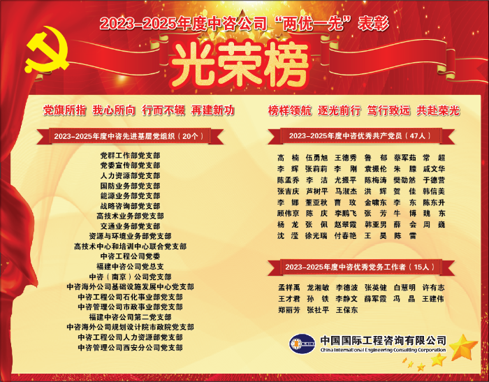 6月30日,中咨公司隆重召開慶祝中國共產黨成立104周年暨“七一”表彰大會,對過去兩年在推進公司黨的建設和改革發展進程中涌現的先進典型進行表彰,進一步激勵各級黨組織和廣大黨員不忘初心、牢記使命,為公司加快建設國家高端智庫和世界一流咨詢機構作出新的更大貢獻。 公司黨委副書記、董事、總經理郭銘群出席會議并講話,受公司黨委書記、董事長茍護生委托,代表公司黨委,向受到表彰的先進集體和個人表示誠摯的祝賀、向奮戰在公司各條戰線的廣大黨員干部職工致以節日的問候,并對各級黨組織和黨員同志提出要求和期待。會議由公司黨委副書記、工會主席朱嵐主持,黨委委員、總會計師王麗靜宣讀公司黨委關于表彰2023—2025年度“兩優一先”的決定,公司領導潘小海、沈浩、劉富榮、李開孟參加會議。 郭銘群在講話中指出,公司各級黨組織和廣大黨員干部職工堅持以習近平新時代中國特色社會主義思想為指導,以開展深入貫徹中央八項規定精神學習教育為動力,聚焦主責主業、把準功能定位,為黨和國家有關重大戰略、重大規劃、重大工程和重大投資政策實施提供了重要智力支撐,并在實踐中深刻認識到:必須始終把黨的事業放在心中最高位置,把“兩個維護”印刻在腦海里、落實到行動上,牢記“黨之大計”、胸懷“國之大者”、助建“國之重器”,以更高站位、更高水平、更高質量服務黨和國家科學決策。 郭銘群強調,公司各級黨組織要扛起主體責任,鍛造堅強堡壘,全體黨員要以黨性立“智”、以清風潤“咨”,進一步堅定發展信心、保持發展定力、搶抓發展機遇,齊心協力譜寫公司高質量發展新篇章。銳意改革攻堅、埋頭苦干實干,不折不扣落實公司“五五戰略”和“3510”策略,以破解發展難題、提升管理效能、防范化解風險的擔當和作為彰顯黨性;堅持從群眾中來、到群眾中去,著力解決職工急難愁盼問題,在開展政策研究和咨詢服務過程中站穩人民立場,以用心用情辦實事的行動和成效彰顯黨性;從嚴從實加強作風建設,以開展深入貫徹中央八項規定精神學習教育為契機,不斷提高拒腐防變能力,永葆黨員政治本色,在共同營造風清氣正干事創業良好政治生態中彰顯黨性。 大會共表彰了20個“先進基層黨組織”、47名“優秀共產黨員”和15名“優秀黨務工作者”。公司領導為受表彰的先進集體和個人頒獎。能源業務部李德波、中咨工程公司牛博、中咨海外公司蘇寶健代表獲獎集體和個人作交流發言。 朱嵐在主持講話中指出,公司全體黨員要以先進為標桿,以典型為榜樣,弘揚偉大建黨精神,進一步提高政治站位、強化政治擔當,堅定奮斗意志、堅定恒心韌勁,永遠保持共產黨員的激情和榮耀,攻堅克難完成年度各項目標任務,以實干實績為黨旗增光添彩。 會議采取線上線下相結合的方式召開。公司總部部門副職及以上管理人員和相應層級專業職級人員、在京所屬企業班子成員和獲獎代表在現場參會。公司總部處級干部和相應職級人員、京外所屬企業班子成員以及各所屬企業黨員代表線上參會。 | |||||