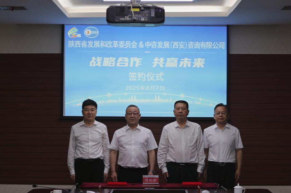 2025年8月7日,中咨發(fā)展(西安)咨詢有限公司(簡稱中咨西安公司)與陜西省發(fā)展改革委簽署戰(zhàn)略合作協(xié)議,致力于創(chuàng)新構(gòu)建全鏈條咨詢服務(wù)體系,助推陜西在新時代西部大開發(fā)中更好發(fā)揮示范作用。中咨公司黨委委員、副總經(jīng)理潘小海與陜西省發(fā)展改革委主任王青峰、陜西省工程咨詢協(xié)會會長張堅出席簽約儀式。中咨西安公司執(zhí)行董事、總經(jīng)理,中咨公司交通業(yè)務(wù)部副主任趙東與陜西省發(fā)展改革委黨組成員、副主任溫志剛代表雙方簽署協(xié)議。雙方舉行座談交流。