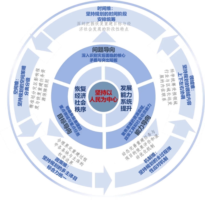 重大自然災害災后重建規劃編制 的方法論探析 索筠博 一、引言 我國是世界上遭受自然災害最多的國家之一。統計數據顯示,2010年以來,全國因自然災害造成的直接經濟損失累計高達5.54萬億元,受災人次累計超過31.03億,其中,青海玉樹7.1級地震、海河“23·7”流域性特大洪水以及西藏定日縣6.8級地震等重大自然災害共啟動國家級二級及以上應急響應十余次,行業系統級響應更是不計其數。 近年來,全球自然災害呈多發態勢,我國極端天氣氣候事件及其次生衍生災害頻次明顯增加,破壞性地震仍處于頻發多發期。趨頻、趨強、趨耦合的自然災害態勢,疊加高度集中的人口和產業分布,給人民生命財產安全和社會經濟穩定運行帶來了系統性風險。黨中央、國務院高度重視防災減災救災工作,習近平總書記多次在不同場合就相關工作發表重要講話或作出重要指示。2023年,中央財政增發1萬億元特別國債,專項用于支持災后恢復重建和提升防災減災能力。 在重大自然災害的災后治理過程中,恢復重建是推動恢復秩序、穩定社會、實現受災區域高質量發展的重要環節。本文立足于重大自然災害災后恢復重建實際,從方法論的角度,探討對于災后恢復重建規劃編制的認識、思考邏輯與統籌方法,提出災后恢復重建規劃編制工作中的一個中心、兩個目標、三個邏輯導向和五個統籌維度,力圖為提升災后恢復重建規劃的專業性、科學性與可實施性提供參考。 圖1 海河"23·7"流域性特大洪水中的霸州市武將臺村 二、災后恢復重建工作的特點 災后恢復重建規劃是整個恢復重建工作的“藍圖”,規劃編制時間緊迫、任務繁重、系統復雜,高質量編制規劃,需要深刻把握重建工作的“急、多、難、高、緊”五重特性。 一是時間緊、任務重。需要在短時間內完成大量恢復重建任務,保障群眾基本生活要求,時間窗口有限、推進節奏快; 二是領域多、系統關聯性強。不僅包括住房、交通、水利、電力等基礎設施,還涉及教育、醫療、生態、產業、社會治理等多個行業領域,涵蓋城鄉多個空間單元,重建任務交織疊加,協調難度大; 三是情勢復雜、動態演變快。災區災情成因多樣、影響范圍廣泛、受災程度差異顯著。同時災區情況因次生災害、資源調整、環境變化、群眾訴求等諸多不確定因素不斷調整演化,動態性強; 四是社會關注度高、群眾期盼強烈。恢復重建直接關系人民群眾切身利益,公眾、媒體和各級政府高度關注; 五是資源有限、問題多元。受災區域發展基礎、資源條件、治理能力差異顯著,恢復需求和優先順序各不相同。面對廣泛恢復需求的同時,資金、人力、土地等各類資源保障能力存在現實約束,資源供需矛盾突出。 圖2 災后恢復重建規劃編制方法要點示意 三、災后恢復重建規劃根本遵循 “恢復重建是一項復雜的系統工程,要科學規劃,精心組織實施。”習近平總書記多次關于災后恢復重建工作的講話精神,集中體現了以人民為中心的發展思想和系統治理、科學重建的理念。要求災后恢復重建工作必須始終堅持以人民為中心,堅持系統觀念,堅持求真務實、科學規劃、合理布局、分步實施,準確把握災區實際和發展潛力,做到因地制宜、突出重點、務實可行。 (一)規劃的一個基本要求:堅持以人民為中心 災后恢復重建規劃編制必須牢固樹立以人民為中心的發展思想。習近平總書記強調:“堅持人民至上、生命至上”“要把保障人民群眾生命財產安全放在第一位,把群眾安危冷暖放在心上”。堅持以人民為中心,要求從全局出發科學統籌群眾利益、社會穩定與發展安全,把切實解決群眾急難愁盼的問題,滿足人民群眾對安全生活、美好生活的需求作為衡量重建成效的根本標準。無論是恢復基本秩序,還是推動重建轉型升級,都需要牢牢把握這一基本要求,確保災后重建成為凝聚人心、改善民生、促進發展的有力抓手。 (二)規劃的兩個基本目標:恢復秩序與系統提升 災后恢復重建不僅是對災損的恢復與補償,更是轉危為機、提升區域治理能力和韌性水平的關鍵窗口期。災后恢復重建規劃的根本任務在于統籌當前恢復與長遠發展,服務人民福祉與區域振興。 其一,恢復災區的生產生活秩序與群眾生活水平。恢復重建的首要目標是盡快恢復災區正常的生產生活秩序,保障受災群眾基本生活條件,推動住房、基礎設施、公共服務、產業體系等加快修復與重建,確保社會穩定與基本運轉。 其二,更為深遠的目標是實現災區的振興發展。恢復重建作為提高災區自我發展能力的重要契機,能夠推動產業優化升級、生態環境修復、城鄉統籌發展和治理能力提升,進而提升區域治理能力和韌性水平,將短期應急轉恢復化為安全發展的戰略起點,實現恢復重建和經濟社會發展的雙贏。 災后恢復重建規劃的內容應充分體現上述兩個基本目標。 圖3 災害影響與恢復重建間的機理示意 四、規劃的“三大”思考邏輯 災后恢復重建規劃編制要把主線思維作為基本思考邏輯,按照“問題導向—目標導向—能力導向”三位一體為核心路徑展開。以問題導向深入識別災后面臨的核心矛盾與突出短板,以目標導向明確恢復重建的重點任務與階段性安排,以能力導向聚焦重建的資源稟賦、政策工具和社會動員能力。 (一)準確評估災害影響,以問題導向理清損失發生的根本原因 準確評估災害造成的影響,